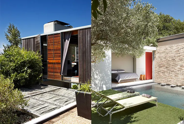 La pared perimetral rodea completamente la vivienda resguardándola de los persistentes vientos de Ciudad del Cabo. Gracias a la abertura del domicilio hacia la dirección opuesta, se puede disfrutar de las magníficas vistas del jardín. Así mismo, la planta incluye una integración total del área social que se despliega en el primer nivel, y la utilización de ventanas deslizantes, de piso a techo, permite una completa panorámica que crea la ilusión de estar en una casa en lo alto de un árbol.