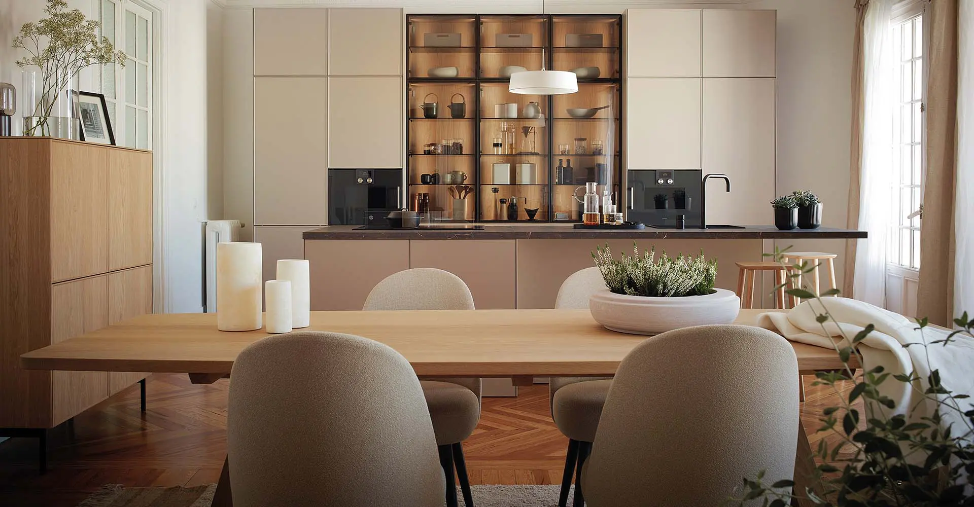 El mobiliario de la cocina lo organizan en paralelo, enfrentando a una gran isla los armarios en columna, los módulos bajos y las vitrinas. La isla reúne las áreas de preparación, fregado y cocción, con encimera en laminado cuarcita imperial de Santos, grifo de la marca MGS, fregadero Franke y placa de flexinducción con campana extractora de Gaggenau.