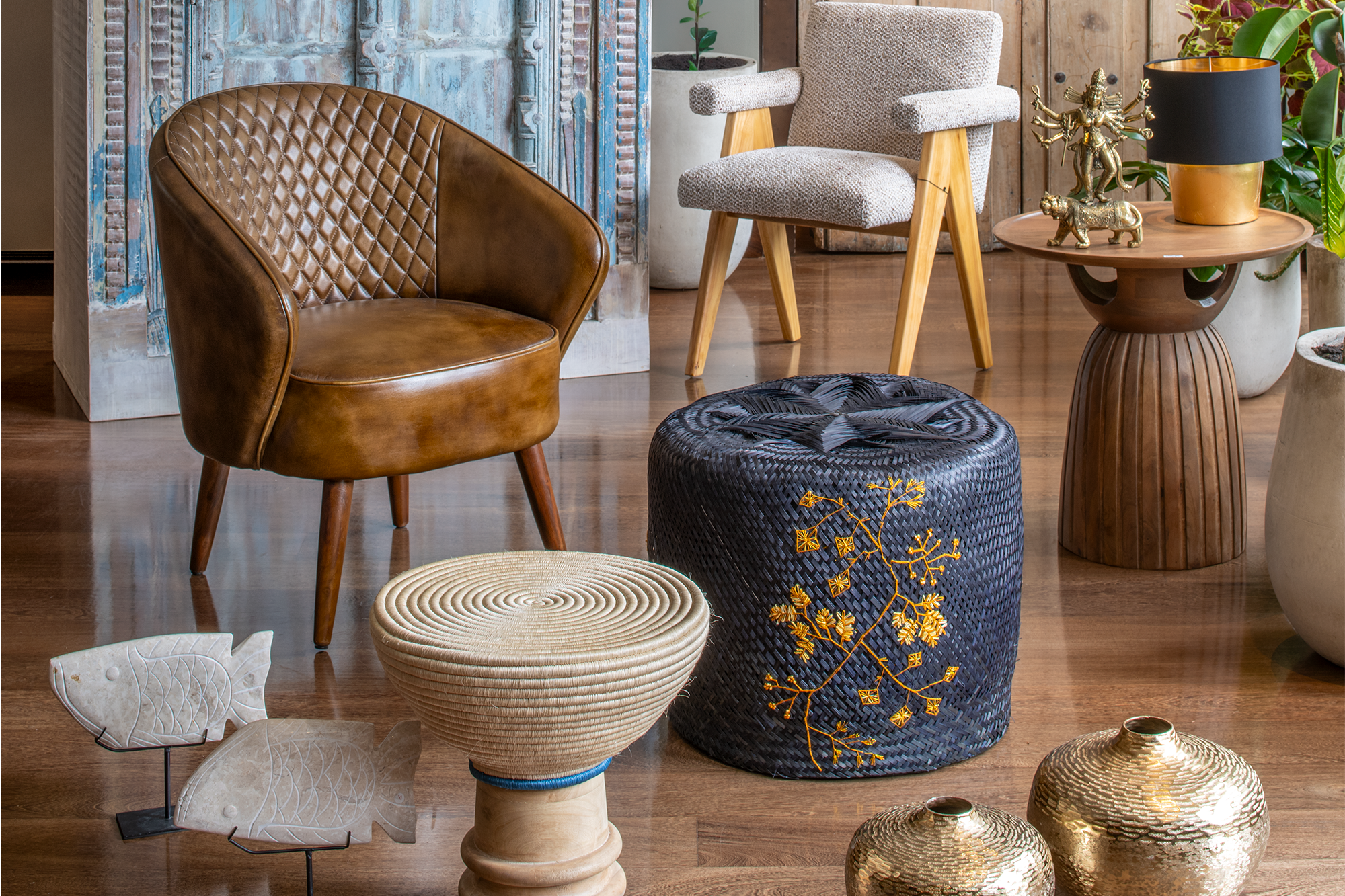Armario tallado, referencia India; frente a este, silla Kong; silla, Vio Gold; mesa, titulada Kerala; sobre esta, figura Durga; en el piso, pescados de mármol, todo lo anterior de Kambora. En el centro, puf Munnozia, en fibra de paja tetera y bordado a mano en hilo y lana por Elsa Hernández; mesa denominada Andes, hecha en fique y en madera de urapán torneada en Sibundoy, los dos diseño de Alejandro Tapias para Alta Estudio. En la mesa, lámpara Manalba; en el piso, set de jarronesKurashiki, ambos de Eglo.