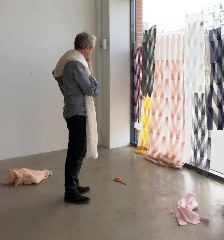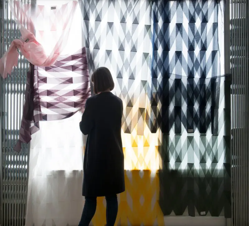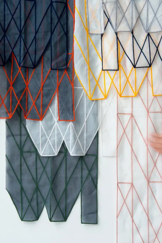 Rennes presenta rayas anchas, diagonales y verticales, densamente cosidas que se cruzan, creando formas coloridas y audaces. Chainettes es más sutil, está hecho de líneas finas bordadas con trenzas. Las cortinas están diseñadas para jugar con luz y sombra. Rennes se pone intensamente colorida cuando se ilumina, mientras que Chainettes es más transparente. La delgada indicación de colores dentro de las líneas reacciona suavemente a la luz.Color y transparencia