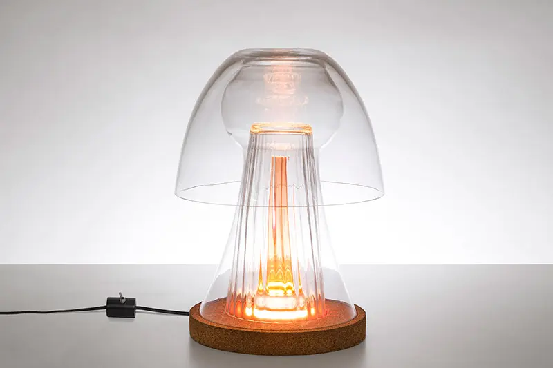 Guto Requena creó la serie Alma para Bertolucci, una composición de capas de vidrio moldeado que crean formas, texturas y colores. Los piezas en cristal se mezclan con una base en corcho cortado con laser, mientras que una luz especial de LED finaliza el diseño.