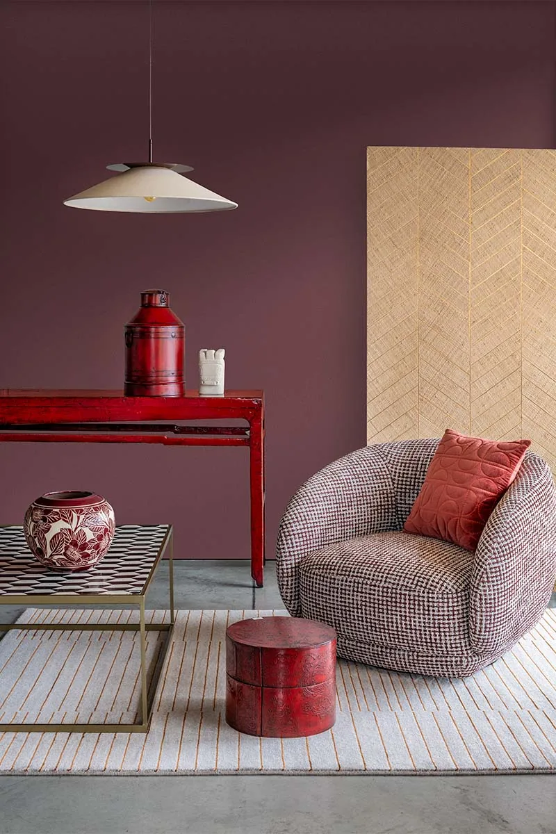 Cada color tiene un poder evocador y, en conjunto, pueden transformar un espacio en una declaración de intenciones. Rojos intensos que inspiran energía, vinos profundos que sugieren sofisticación, rosas que suavizan, cremas que equilibran y marrones que aportan calidez. La mezcla de esta paleta no solo embellece, sino que invita a vivir el diseño desde la emoción y la experiencia. Diseño con texturas y formas Consola roja, referencia Kandiri; mesa Udaipur; vasija Flores; cantina pintada; cabeza de caballo; baúl circular; cojín Kushi; recubrimiento Solal Merina, todo lo anterior disponible en Kambora . Butaca, titulada Bolzano, de la marca BoConcept . Lámpara de techo Flat, de Vintario . Tapete Patina, de Tejidos LAV . Paletas de color y texturas que inspiran Candelabros, referencia Kassa; en la pared, en el centro, retablo Toraja; poltrona Bora Bora; cojín Kushi; lámpara Nacar; textil mural Mural Archipel Kansai, todo lo anterior lo encuentra en Kambora . A la izquierda, aparador Click Clack; en el piso, jarrones Barfly rosa, todo lo anterior disponible en Kare . Puf Bermuda; mesa Sweet Art, todo lo anterior de BoConcept . Tapete Prisma, de Tejidos LAV .