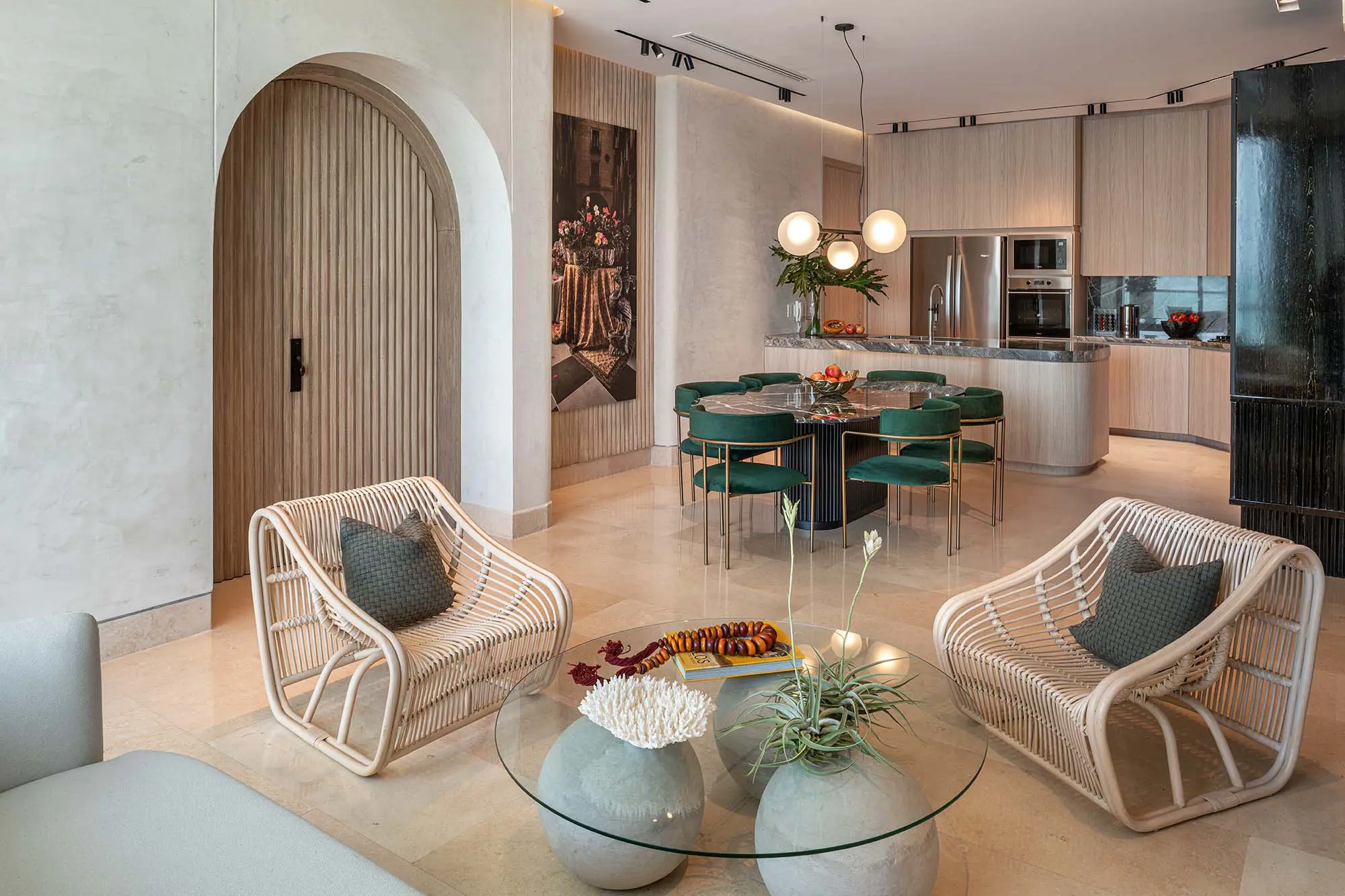La búsqueda de un lenguaje renovado con una identidad propia estuvo acompañando el proceso de diseño desde un comienzo. “El concepto de apartamento de playa está en desuso, razón por la que como equipo le apostamos a la recuperación de esta idea mediante el uso de geometrías curvas y una paleta de materiales y texturas sobria”.
