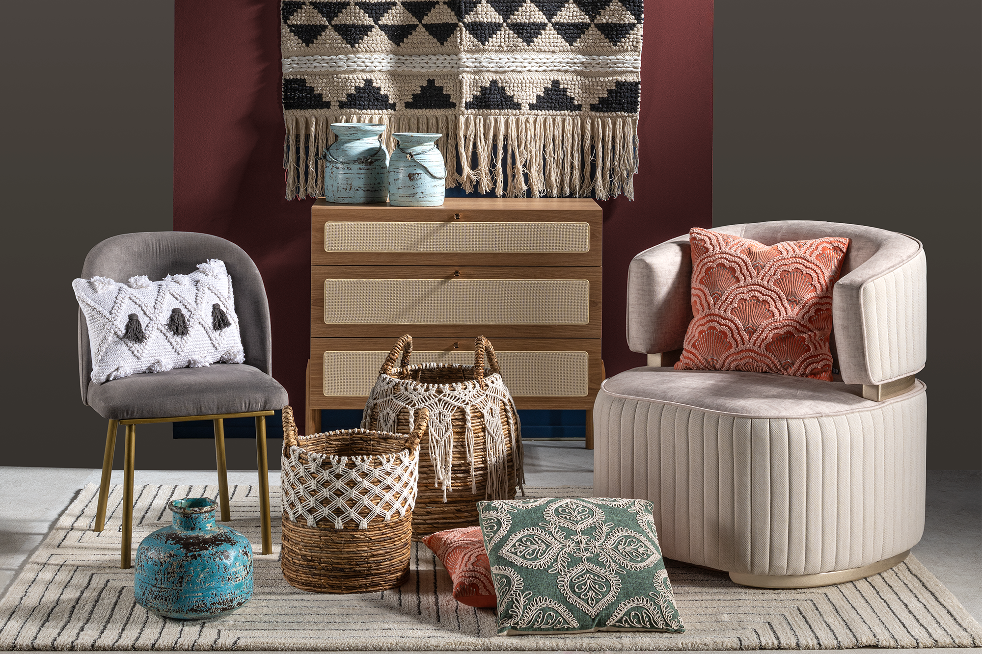 Cómoda referencia Santorini, color natural, con tejido; al frente, a la derecha, butaca Atlanta Velvet Boho Home; en el piso, cojín titulado Concept, en poliéster verde bordado mandala, todo lo anterior disponible en la tienda de Jamar.