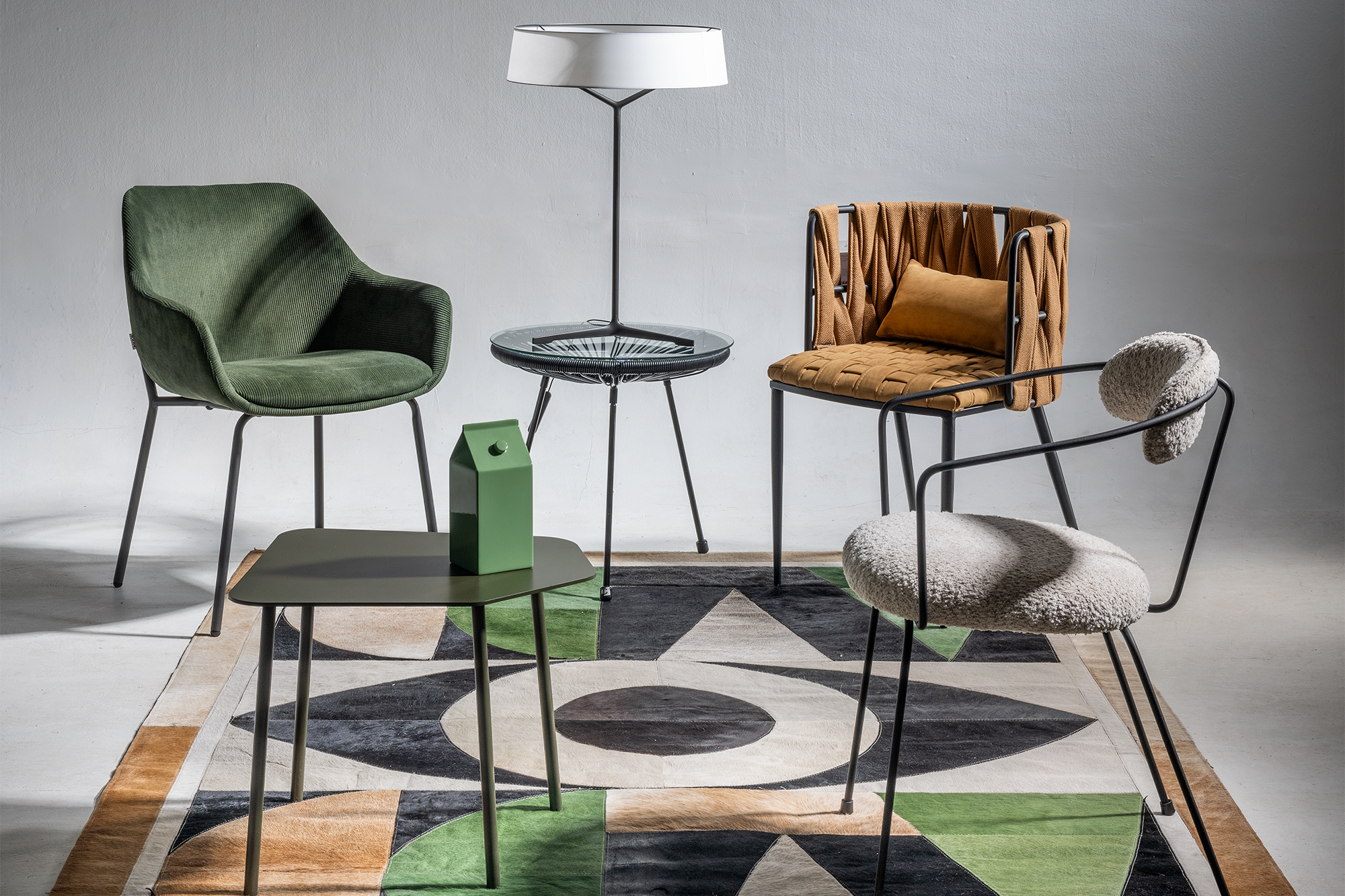 De izquierda a derecha se ubica silla, referencia Rep. Avignon verde; mesa auxiliar Acapulco negro; silla Rep. Cheerio amarillo; alfombra Piel Watching, de 170 × 240 cm, todo lo anterior es de Kare.