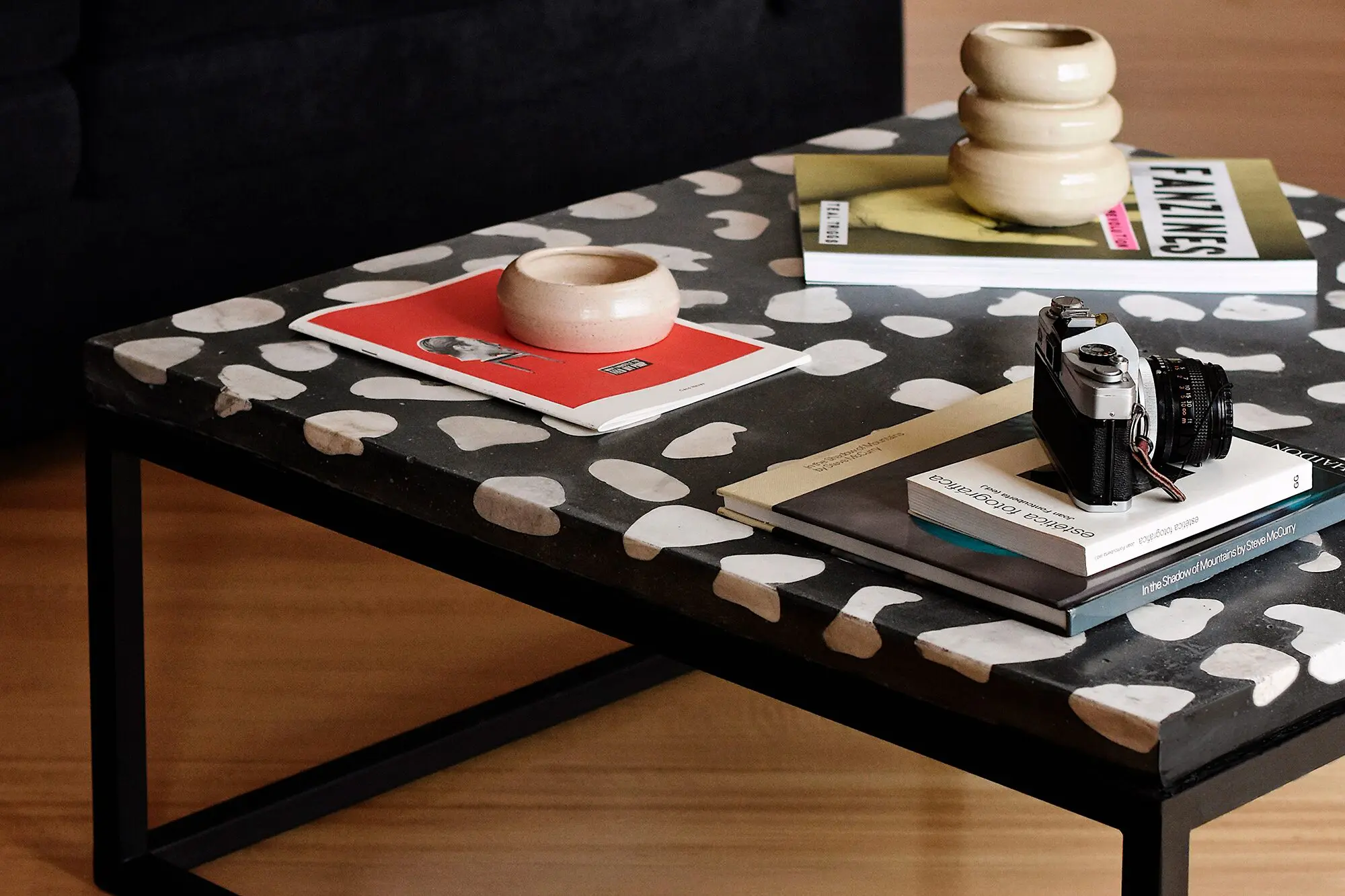 La primera colección de En Las Rocas se llamó Génesis. “Reflejaba una idea de nacimiento después de la pandemia, salir de la oscuridad”, señala Marchesi. En esta línea, experimentó con los contrastes entre blanco y negro en piezas como mesas de diversos tamaños, floreros y materas. Con eso se alejó del tradicional uso del terrazo en pisos, que recuerda a las casas de las abuelas.