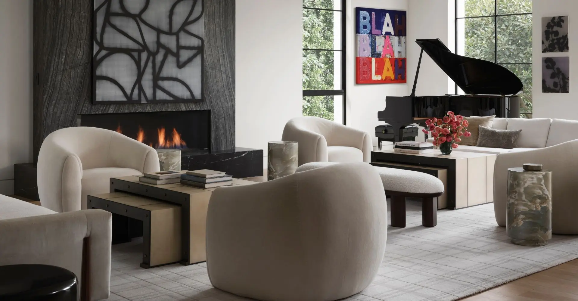 Muebles esculturales, sillones giratorios de Axis Furniture, sofás a medida de Bright Chair Company y mesas de centro de Jean De Merry, crean un juego rítmico entre suavidad y estructura. Una alfombra de Scott Group refuerza este diálogo, con su sutil patrón de cuadrícula que evoca los elementos circundantes.