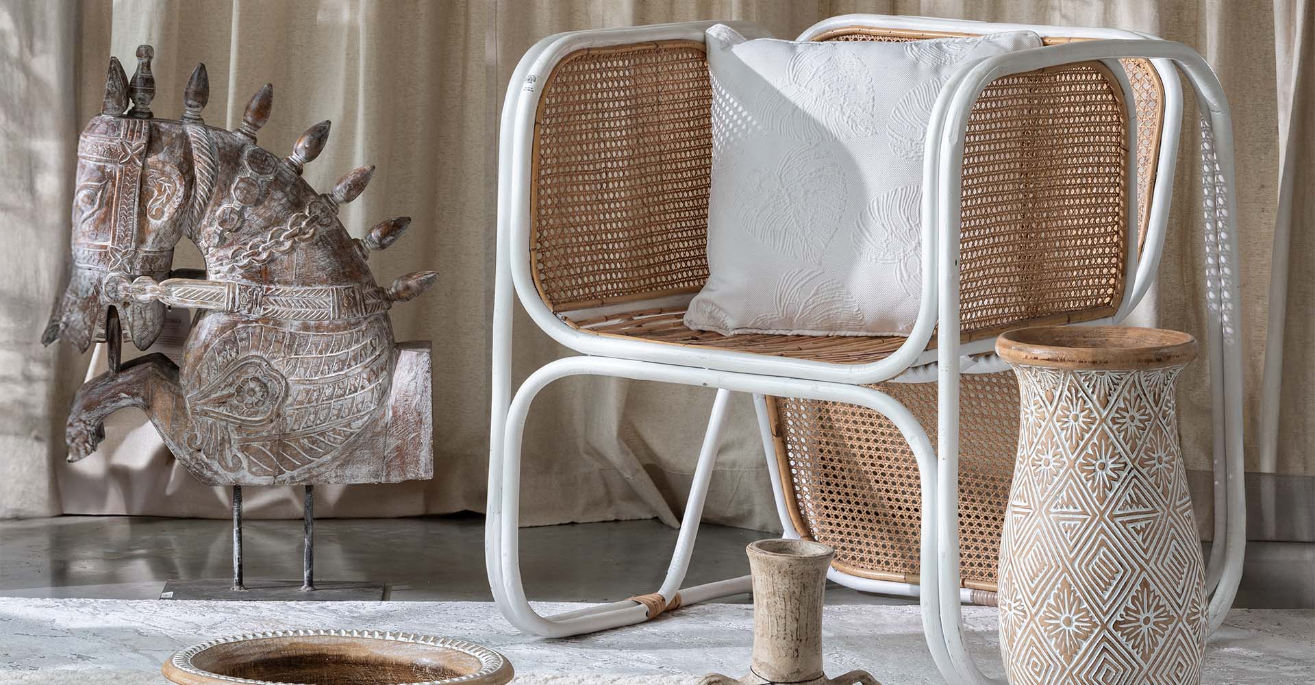 Piezas de corte artesanal, con un lenguaje muy sereno, se unen a la tranquilidad del color blanco para construir una atmósfera en equilibrio.