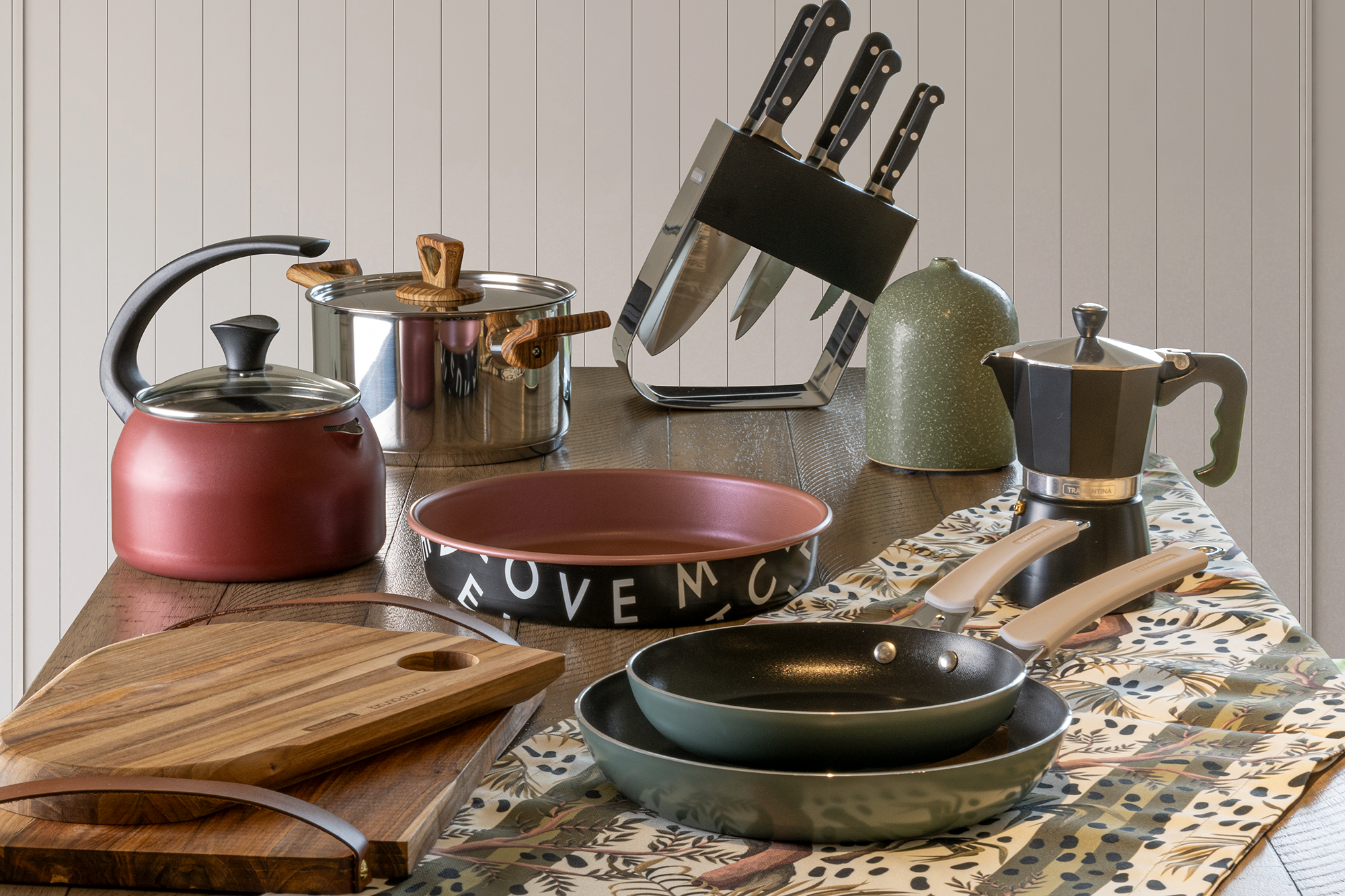Tetera de aluminio; en el medio, asadera My Lovely Kitchen; cafetera espresso, italiana, de aluminio negro; parte del set de batería de Cocina Brava, de acero inoxidable, mangos y asas con terminación efecto madera —cuatro piezas—; juego de cuchillos de siete piezas, todo lo anterior de Tramontina. Accesorio de decoración, referencia Dorelia, de Ashley.