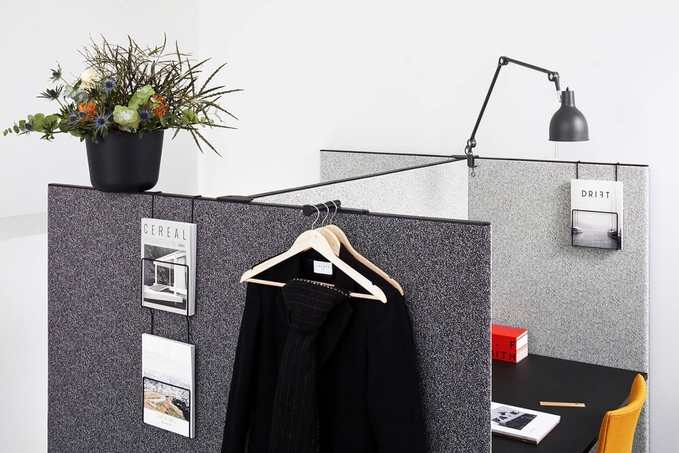 El objetivo de Thomas Bernstrand en el diseño de dB era permitir a las personas dejar una impresión en su entorno: convertir al individuo en cocreador. De este modo, las pantallas se pueden tapizar en cualquier tela, y la serie incluye una pantalla blanca, una de corcho para boletines y una gama de accesorios inteligentes para acomodar fotos, revistas y otros artículos personales. El detalle de Bernstrand como diseñador aparece en forma de maceta opcional, balanceada de manera improbable en el borde superior de la pantalla de dB.