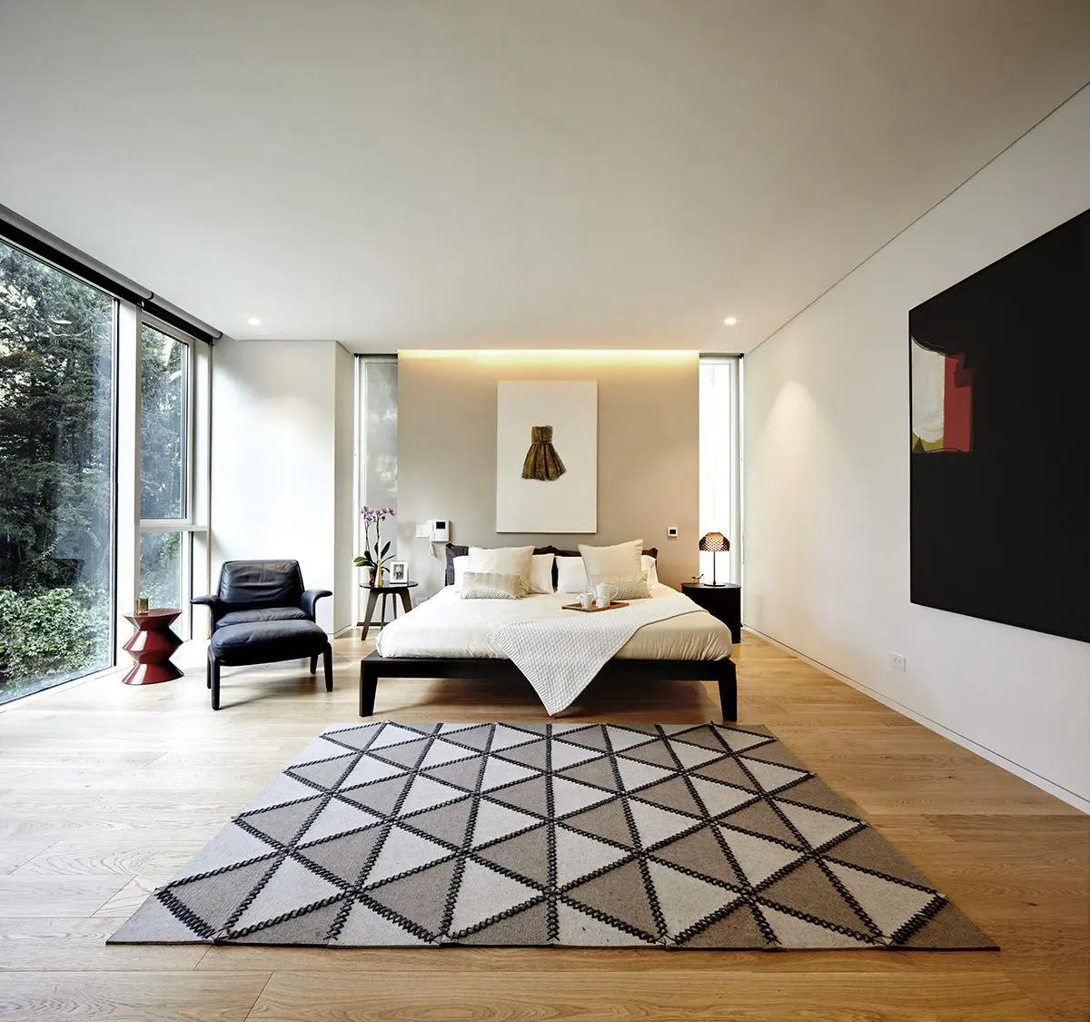 En esta habitación, el piso de roble Aurora –importado de Portugal por la compañía J. Albornoz– otorga mediante sus vetas un aspecto natural y propicia una conexión con el entorno cercano para un descanso pleno. Sobresale el formato premium size de este piso multiestructurado, de 18 centímetros de ancho por 1,80 metros de largo.