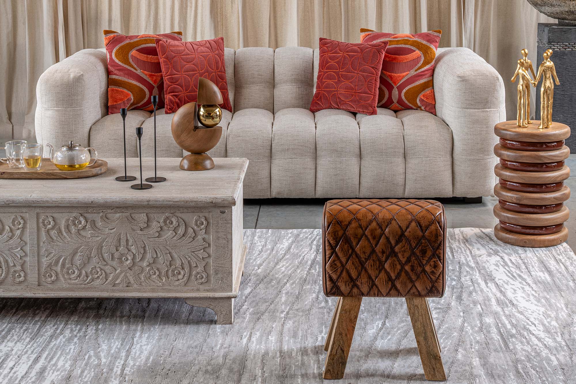 Sofá en la referencia Puffed Roba; sobre este, cojines Kushi Retro; cojines Kushi Durazno; enfrente, baúl tallado; sobre él, la bandeja titulada Kassa; escultura Bola; adelante, a la derecha, butaco de cuero Kong; atrás, a la derecha, escultura Familia, todo lo anterior disponible en Kambora.