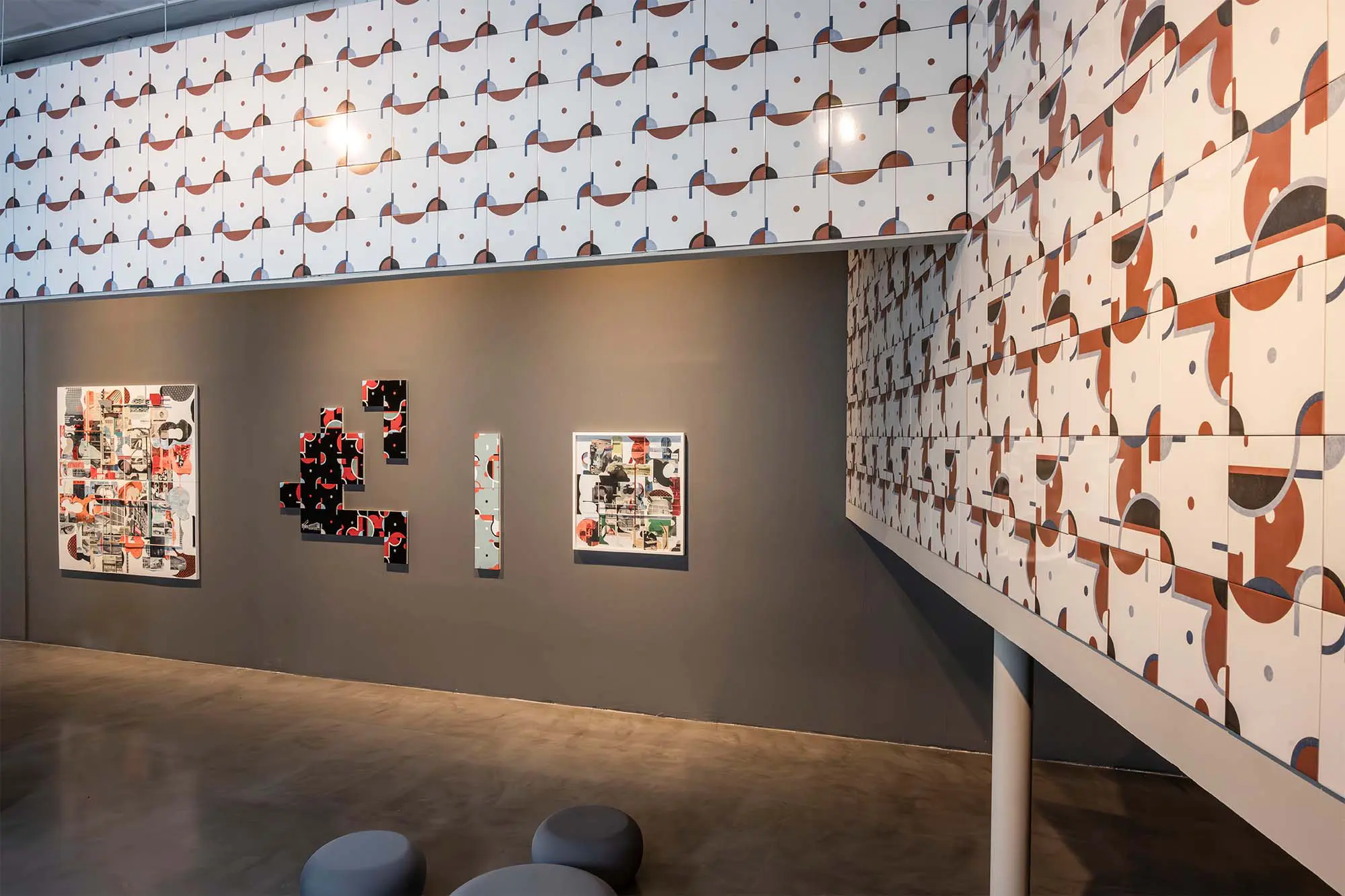 El último componente de la exposición es un muro donde hay piezas plásticas, con técnicas como el collage, realizadas con recortes o fotografías de arquitectura de los años cincuenta y sesenta. “También hay estudios de pintura en las baldosas que forman parte de los murales, estudios pictóricos modulares que hemos llamado elementales. Son objetos que se pueden combinar de diversas formas”.