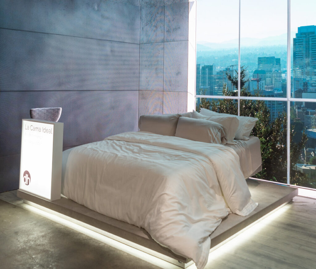 Un juego audiovisual construido con dos grandes pantallas y un espejo como cielorraso fue el mayor atractivo de la propuesta de la compañía Distrihogar. Los visitantes aprovecharon para tomarse fotos en la cama —tendida con productos de la marca—, que reposaba bajo esa instalación inmersiva.