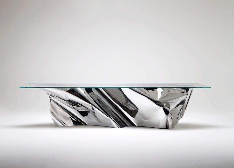 Creaciones como la edición de mesas Atlantic table para las que se utilizó acero inoxidable pulido, vidrio negro para la tapa y cristal son prototipos que resaltan estas características inherentes. Las veinte piezas se hicieron a mano y ninguna es igual a la otra. La base en acero moldeado como si se tratara de un papel le da fluidez al modelo.
