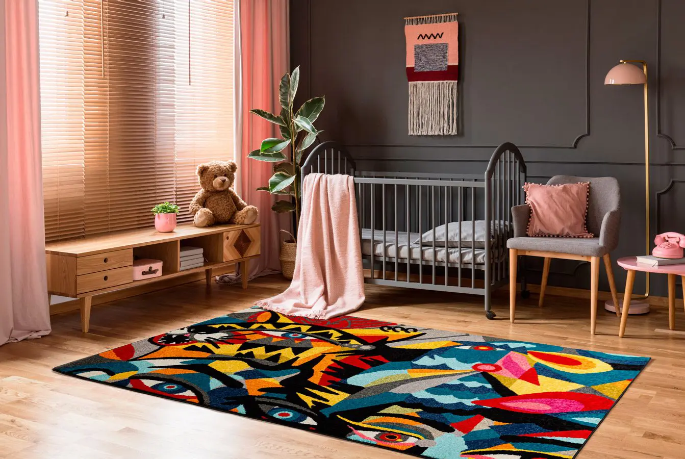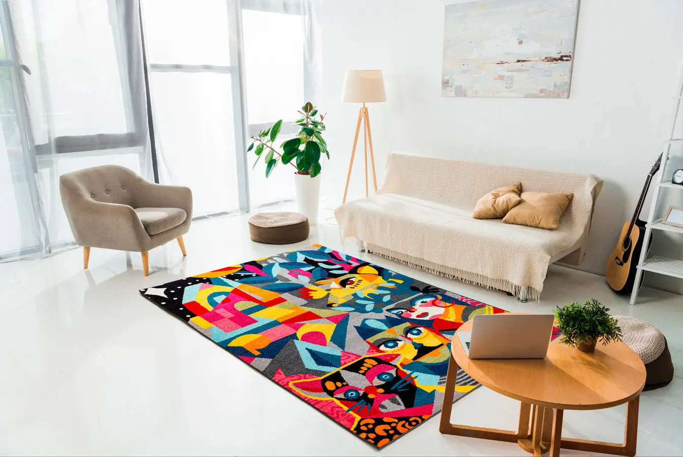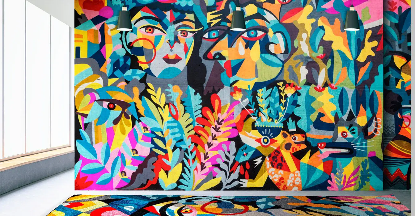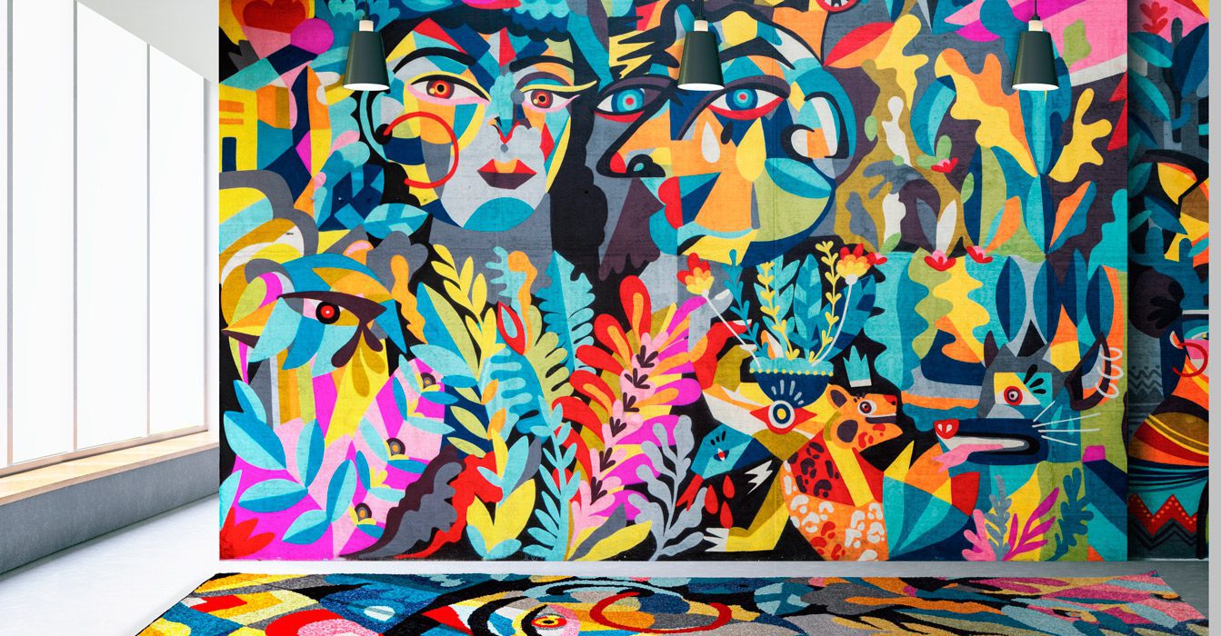 Debido a su incesante deseo de experimentar, la artista bogotana contactó a Tejidos LAV para realizar, por primera vez en su carrera, una línea de tapetes con sus diseños. “Muchas veces me contratan para pintar fachadas de tiendas o casas y, así, mi obra se vuelve arte público. Acá tomo el muro que hice para ellos, lo divido en seis secciones y creamos las alfombras. Ahora las personas pueden llevárselas a sus casas y lo que era público pasa a ser privado, un objeto de diseño”.