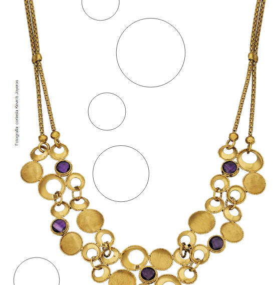 Esta gargantilla de oro amarillo de 18 kilates, con visos satinados, es un diseño de la compañía Kevin’s Joyeros. Su tejido en estilo pop corn tiene distribuidas de forma armoniosa cinco amatistas, que aportan un toque de color sutil. www.kevins.com.co