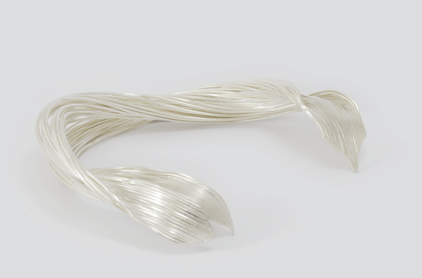 Esta gargantilla, parte de la serie “Las margaritas del pantano”, fue elaborada por el joyero bogotano Alec Niño y está inspirada en una especie endémica del humedal de La Conejera, en Suba. Elaborada en hilos de plata y esmaltes clásicos, es una joya única que mezcla la artesanía con el diseño contemporáneo. info@doceuno.co