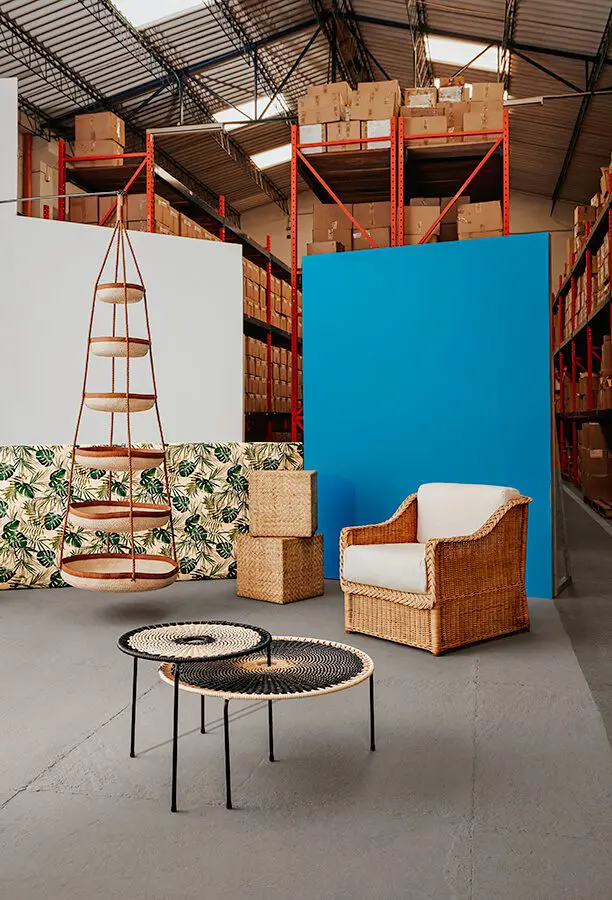 Juego de canastos trenzados en palma real y cuero, de Artesanías de Colombia. Cubos tejidos en ratán, en espina de pescado, pueden ser usados como puf o mesa auxiliar; poltrona de ratán con tejido tradicional; cojines de lona cruda hechos en algodón, todo lo anterior de Deimos Arte. Mesa, ref. Bellavista, con tejido artesanal en cuerda de PVC y estructura de varilla de acero, de Tucurinca.¡hecho en colombia!
