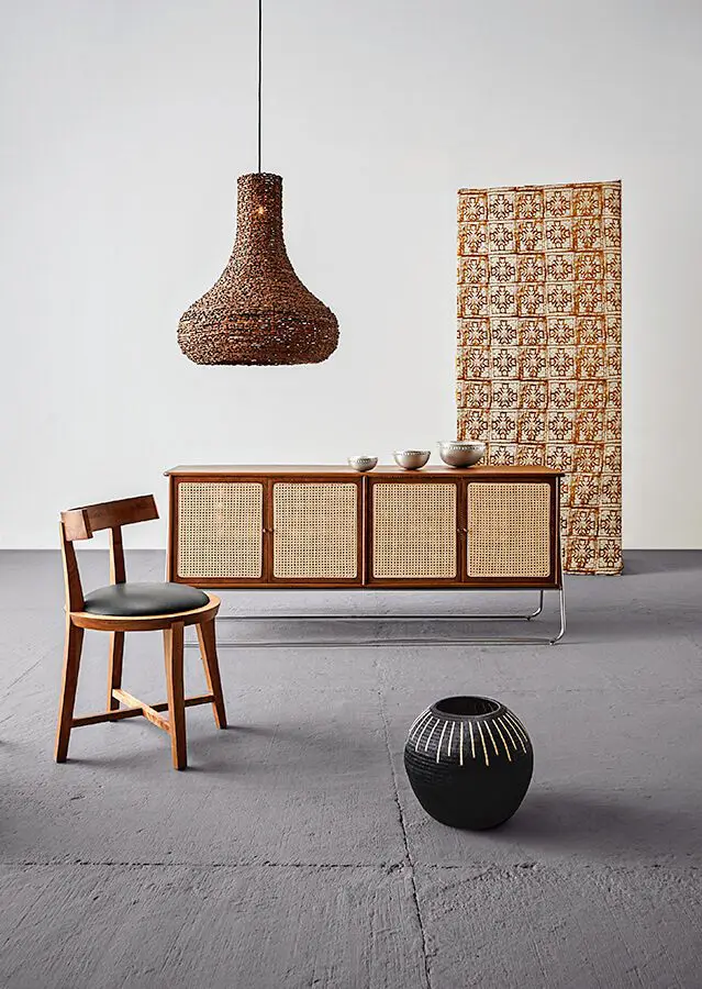 Silla, su forma hace referencia a la colección Génesis, de Casa Collage. Lámpara, ref. Gota, de palma de seje, diseñada por el equipo central de Artesanías de Colombia. Vasijas de plata gratada, moldeada a mano, de Argenta Platería. Mueble para almacenar, fabricado en madera flor morado, con bases cromadas de madera flor morado y mimbre en las puertas, de Moblar. Jarrón de lluvia, de la etnia wounaan, fabricado en palma de werregue, de Artesanías de Colombia.¡hecho en colombia!