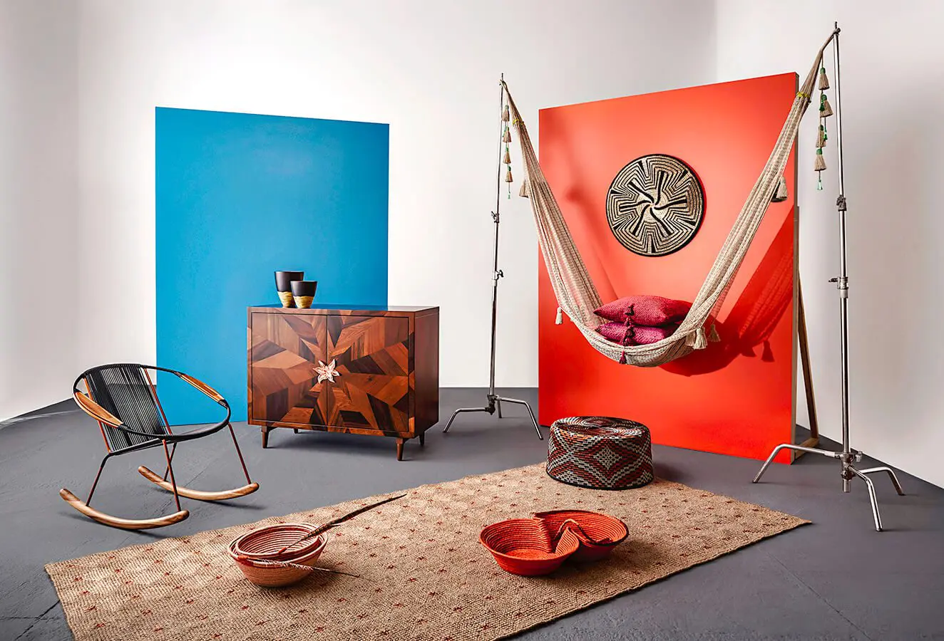 Mecedora de fibra sintética, de Tucurinca. Mueble de madera flor morado, decorado con un aplique de filigrana hecho por artesanos de Mompox, Bolívar, finalizado con baño de oro rosado, diseño de Ángela Ramos G. Jarrones, ref. Montaña, de madera y tamo, parte de la colección de los Laboratorios de Diseño e Innovación de Artesanías de Colombia. Disco de fibra natural y bronce, hecho en técnica de werregue; hamaca de lino italiano, con borlas de metal y lino; cojines de cinta de acetato, borlas de seda y piedras semipreciosas; puf en técnica werregue, de metal, plata, cobre y fibra natural negra; vasijas de cordón, algodón y cobre, con plumas de faisán y acentos de metal; bandeja ocho, hecha en cordón de algodón y cobre con degradado en metales; tapete de fique y cobre anudado, ref. Chicamocha, todo lo anterior de Hechizoo. ¡hecho en colombia!