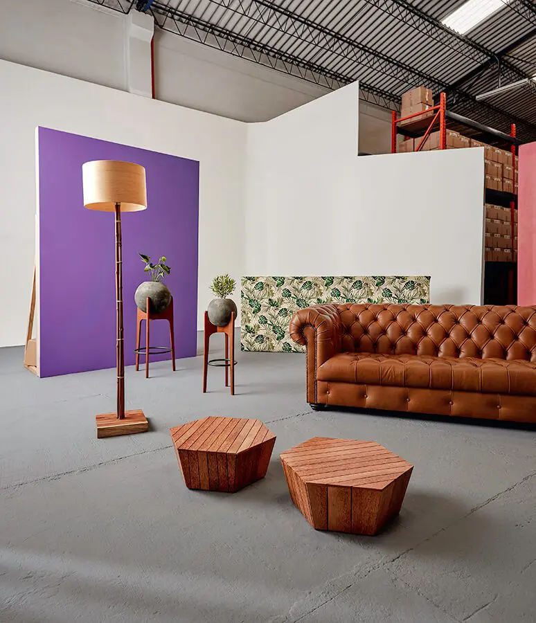 Lámpara de pie hecha en guadua con caperuza de madera en chapilla de bambú, de Deimos Arte. Materas, ref. Orbe, compuestas por una esfera de concreto que descansa sobre un trípode de madera de granadillo, de Moblar. Sofá, ref. Chester, de Zientte. Mesas de centro hexagonales hechas en madera, de Entable.¡hecho en colombia!