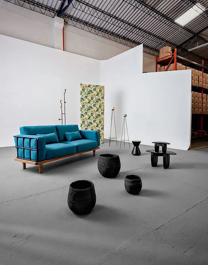 Sofá, ref. Grid, con estructura interna de madera sólida, externa de hierro y patas de flor morado, de Bombox. Perchero fabricado en varilla redonda, con acabado en pintura negra y dorada electrostática, de The Blue House. Huevos hechos en cerámica de alta temperatura, esmaltados y con reserva en cera de abejas, puestos sobre bases de hierro, fabricados por María Cano, para Salvaje Cerámica. Stool torneado en madera flor morado, con acabado en anilina natural, de CarmWorks Studio. Banquitos de madera flor morado, diseño de Danilo Rojas para la colección exclusiva de Zientte. Contenedores modulares de cerámica para exhibición, su borde fue rematado con las huellas de los artesanos que participaron en su creación, diseñado por David Del Valle.¡hecho en colombia!
