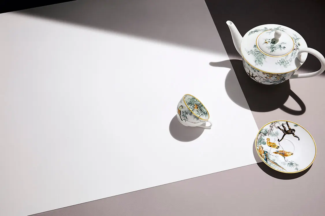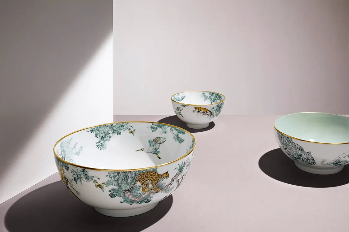 Pumas, Panteras, Tigres, Jaguares, micos y pájaros exóticos recorren la mesa entre platos, pocillos, tazas y bowls en porcelana, piezas que llevan el sello de calidad y manufactura impecable que solo marcas como Hermès pueden brindar.
