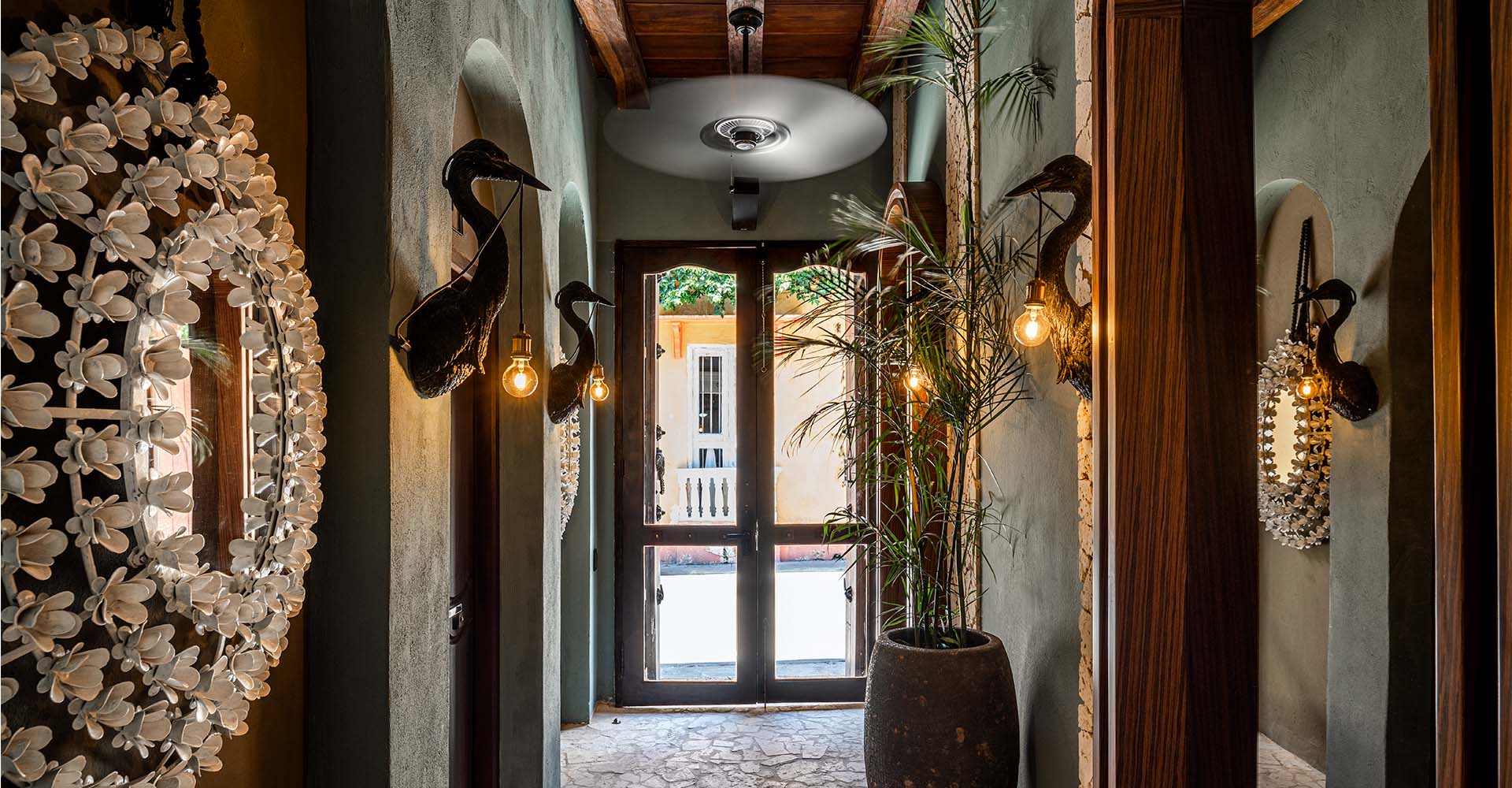 La iluminación cumple la misma función. En vez de recurrir a luminarias protagónicas o a intensidades altas, se utilizan fuentes de luz tenue que acompañan la rugosidad de los muros y la geometría de los corredores. Con las lámparas —algunas diseñadas por Mezk, otras traídas de la India— no se busca introducir un estilo ajeno, sino aportar un peso material que se siente coherente con la arquitectura restaurada.