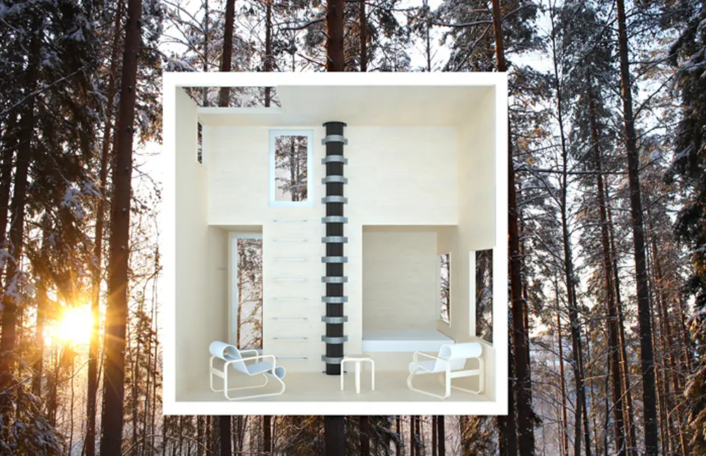 Literalmente construido alrededor del tronco de un pino altísimo, a medio camino entre el suelo y el cielo, este hotel, hecho de una estructura de aluminio liviano, es una edificación funcional amigable con el medio ambiente. Por fuera, la estructura cúbica esta recubierta con espejo, un material que camufla la construcción con el paisaje que la rodea y que además refleja en 360 grados la magnificencia del lugar en el que se ha asentado. Por dentro, la estructura está recubierta con madera contraparchada, un material extraído localmente.