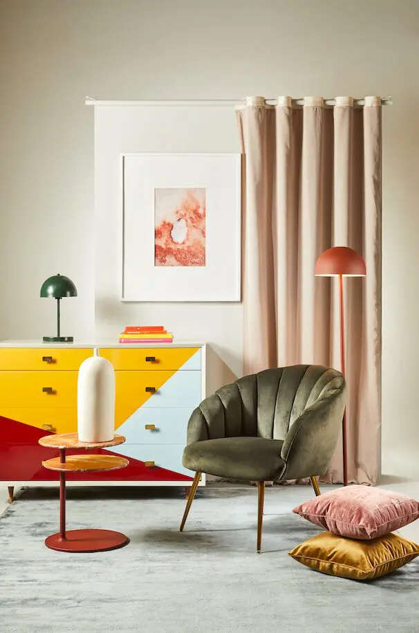 Página opuesta. Tapete colección Solid, fabricado en seda viscosa, de CB Rugs. Funda cojín, ref. Basic Velvet, color oro; lámpara de piso, ref. Pole Domo, de metal, roja; poltrona, ref. Daniella, de terciopelo verde y patas doradas, todo lo anterior de Tugó. Cortina velo lino, color Balme Taupé; cojín, ref. Oxide Salmon, de terciopelo, ambos de Interiority. Mueble cajonero 1960, fabricado en madera, poliuretano y bronce, de Dessvan. Lámpara de mesa, ref. Pollux verde, diseño Vida Útil, en Casa Folies. Mesa auxiliar roja dos niveles, ref. Vicino, firma Molteni, diseño Foster + Partners, en Schaller. Botella, ref. Orante #3, de cerámica; impresión digital de la serie Galerazamba 2019, autor Felipe Hoyos, lo anterior en Diamantina & La Perla.