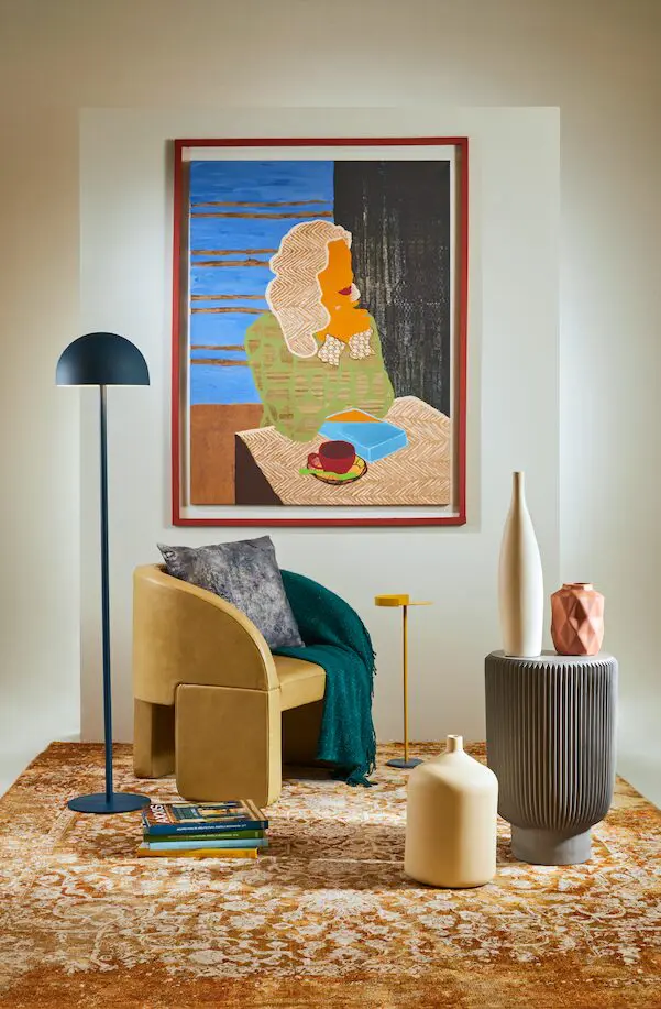 Tapete, ref. Patina, fabricado con 60 % de polipropileno y 40 % de poliéster, de Tejidos LAV. Lámpara de piso, ref. Pole Domo, de metal azul; florero, ref. Geométrico Nuba, pequeño, sobre la mesa a la izquierda, ambos de Tugó. Poltrona, ref. Lazybones Lounge, firma Baxter, diseño StudioPepe; mesa auxiliar gris redonda, ref. Juno, firma Baxter, diseño Draga & Aurel, ambos en Schaller. Frazada, ref. Kamet, color verde esmeralda; cojín, ref. Rust Zafiro, de terciopelo, ambos de Interiority. Obra Una tarde, técnica collage y acrílico, 2021, de la artista Gabriela Sánchez. Mesa, ref. Solo Verano, fabricada de acero cold rolled y pintura electrostática, diseño Folies, en Casa Folies. Botella, ref. Orante #6; jarrón, ref. Tulsa #1, en el piso, ambos de cerámica, de Diamantina & La Perla.