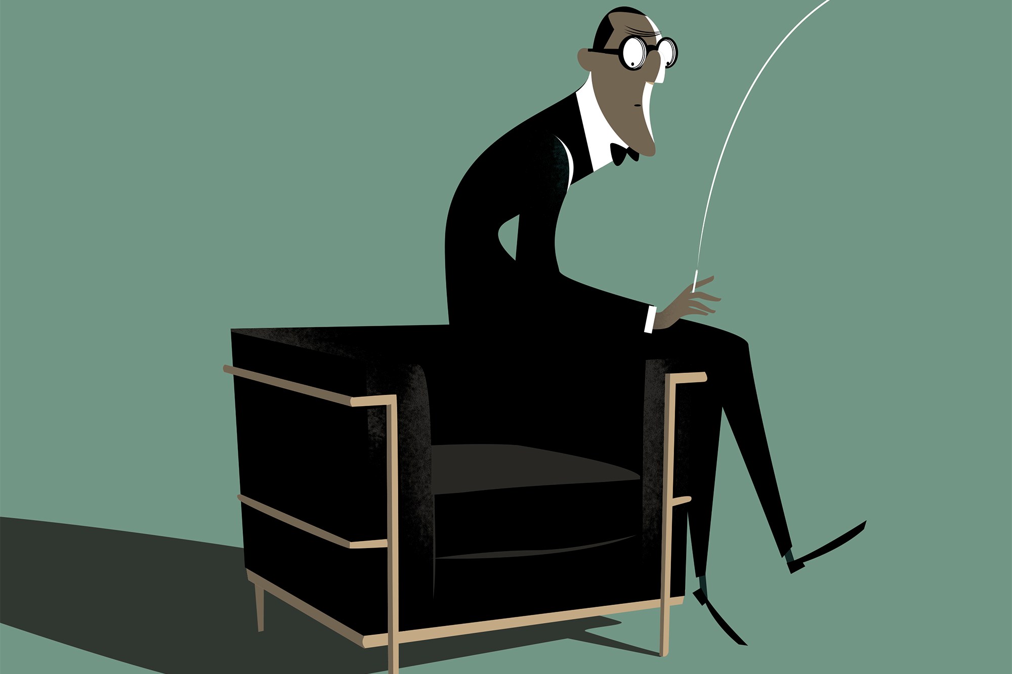 Arévalo aprovechó las reconocibles características físicas del arquitecto y urbanista para resaltar su altivez y sofisticación: aparece recostado en el brazo de la silla —en este icónico diseño, los brazos están al mismo nivel del espaldar—, un poco encorvado y de piernas cruzadas, vestido de esmoquin, mientras su cigarrillo emite un camino certero de humo.