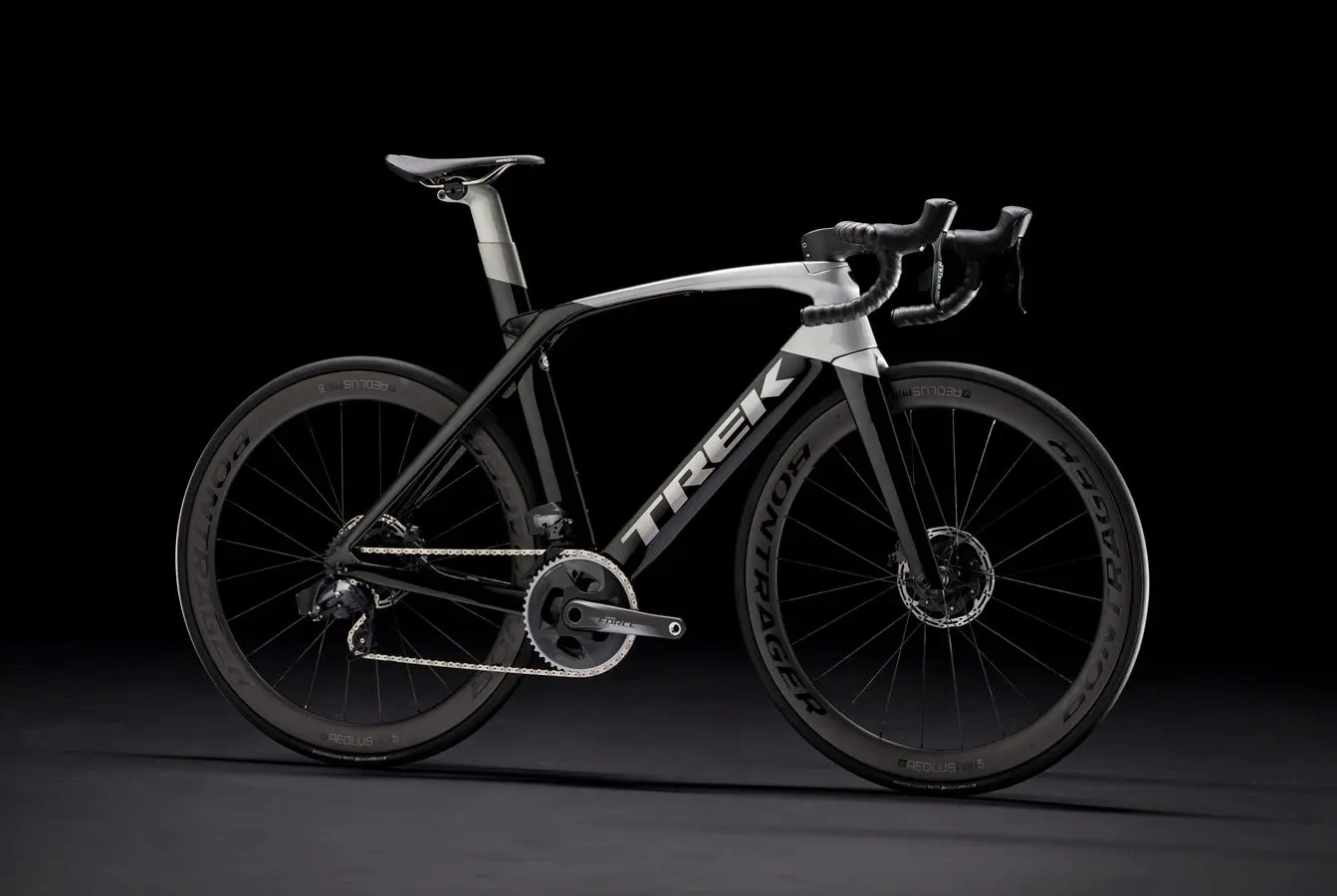 Disco completamente de carbono Madone KVF, poste de dirección cónico de carbono, portaejes de carbono, enrutamiento de cables oculto, frenos de disco de soporte plano, eje pasante de 12 mm.