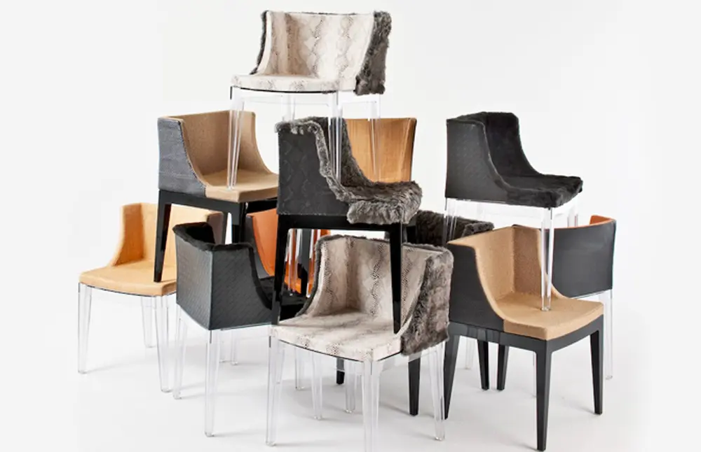 Pitón, fur y rafia, cada una con opción de estructura de policarbonato transparente o negro, son las referencias de la colección Kartell goes Rock, cuyos materiales principales fueron cuero, piel ecológica de colores grises y negros y tejidos impresos de pitón. El trabajo contó con el equipo del taller de diseño del cantante. La firma Kravitz Design Inc. lleva diez años en el barrio SoHo de Nueva York y ha contribuido en la creación de objetos para Swarovski y el interiorismo de hoteles en Miami.