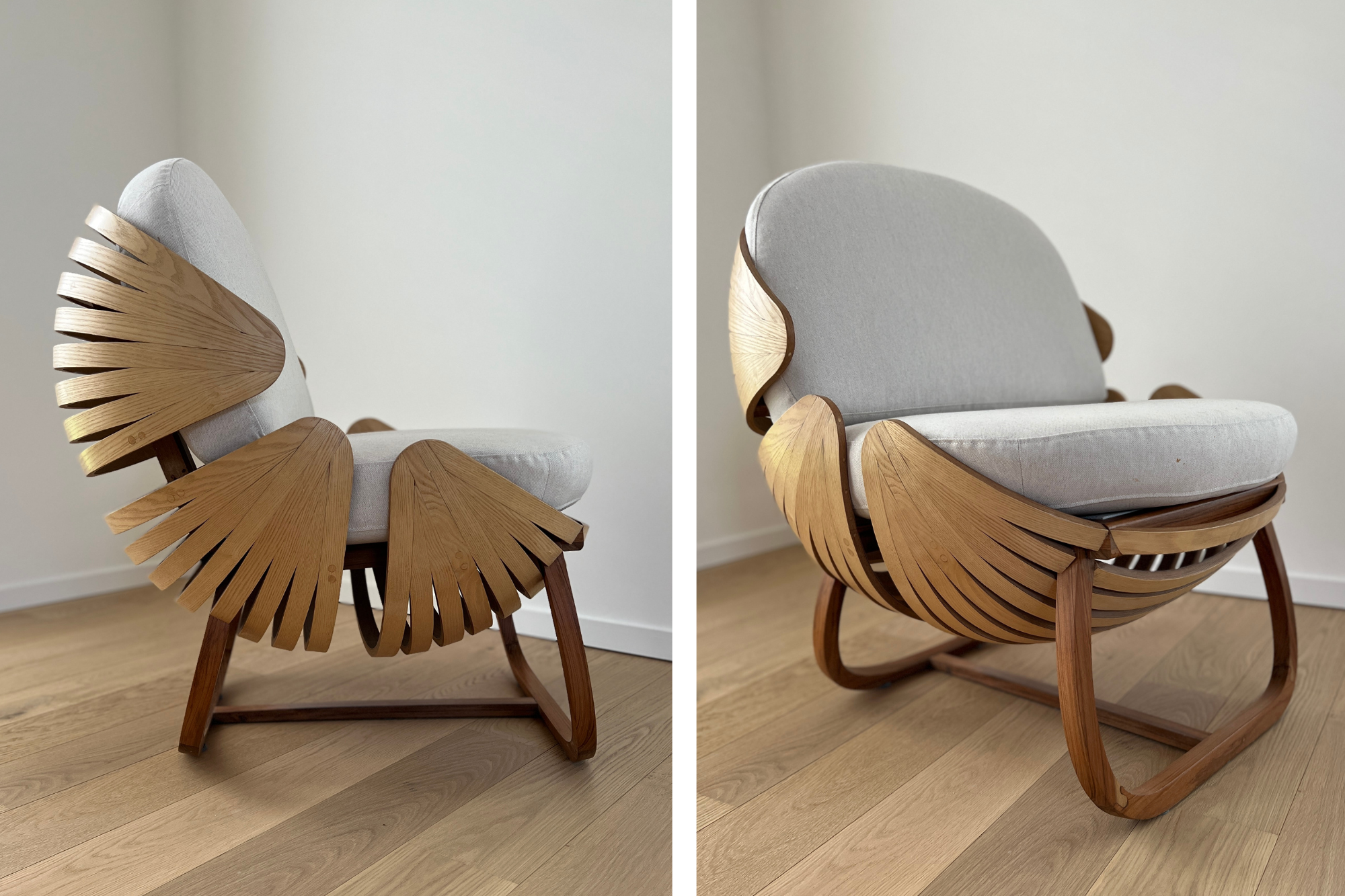Para lograr este propósito, se trabajó con las láminas de Fresno —una madera muy fuerte pero muy elástica—. Al prensarse en un molde, estas láminas se aglomeran y se curvean. La estructura y las patas se fabricaron en teka.