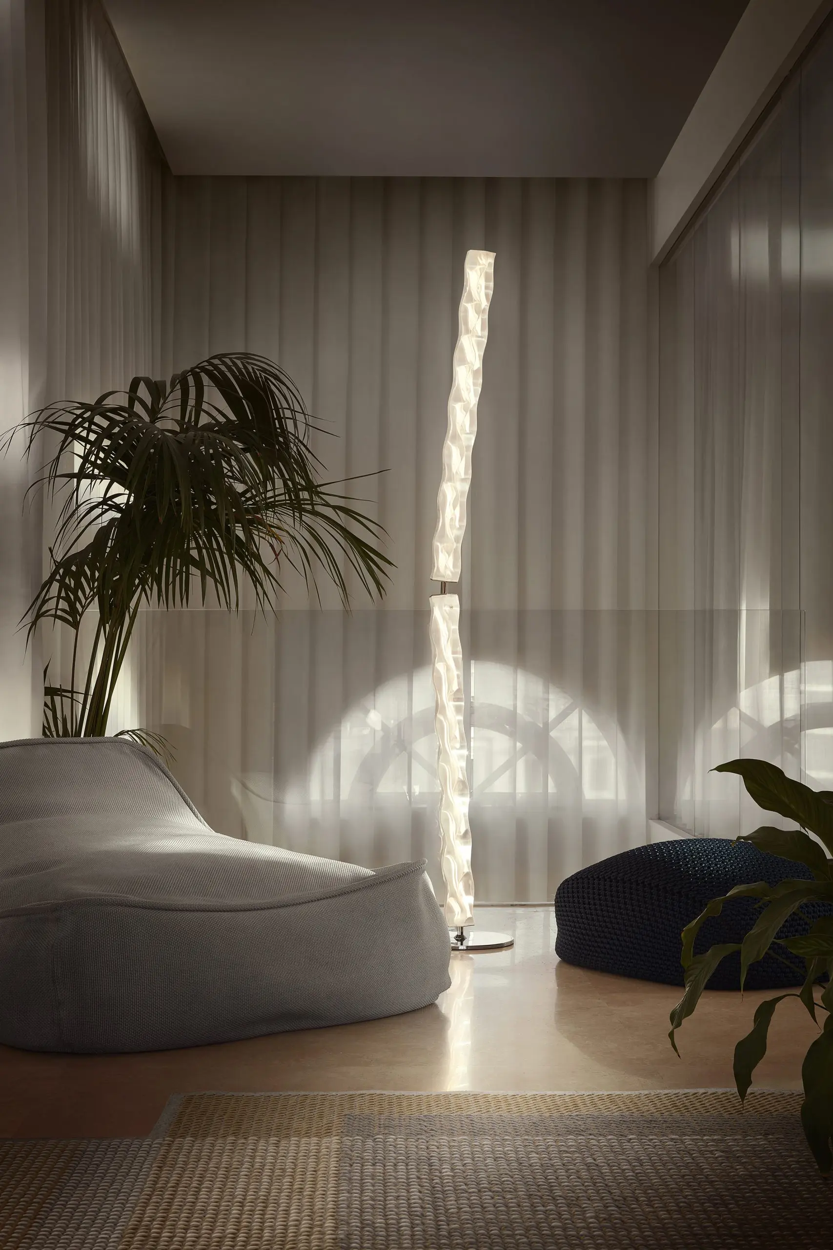 El diseño parte de módulos de un metro de largo, que pueden conectarse entre sí para llegar hasta los siete metros. Como novedad, la colección de piezas horizontales suspendidas incluye este año una vertical. Su lámpara de piso tiene una altura de 2,07 metros, con una inclinación fija que sobresale por su balance y equilibrio.