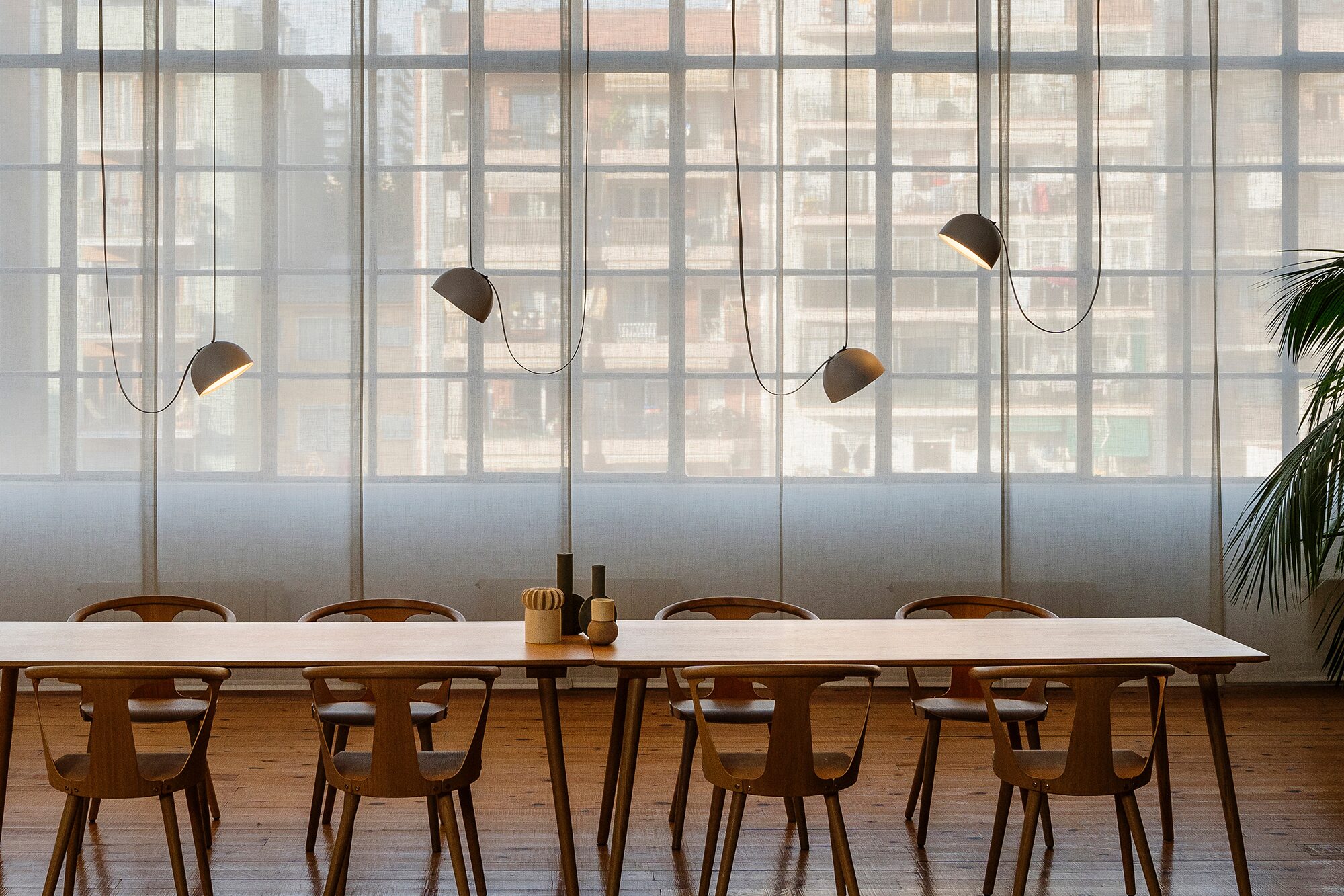 Los elementos separados del sistema de iluminación se articulan de tal manera que eleva lo funcional para convertirse en una característica del espacio, de esta forma, estas lámparas se vuelven parte de la arquitectura del lugar.