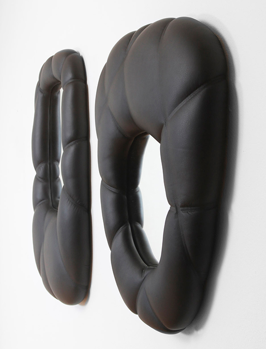 A los espejos se les amarran unas cuerdas para crear las marcas en el cuero negro y luego se calientan en un horno, al enfriarse se retiran las cuerdas y quedan las líneas permanentes para darle más textura y un diseño más soficticado y refinado a estos controversiales accesorios.