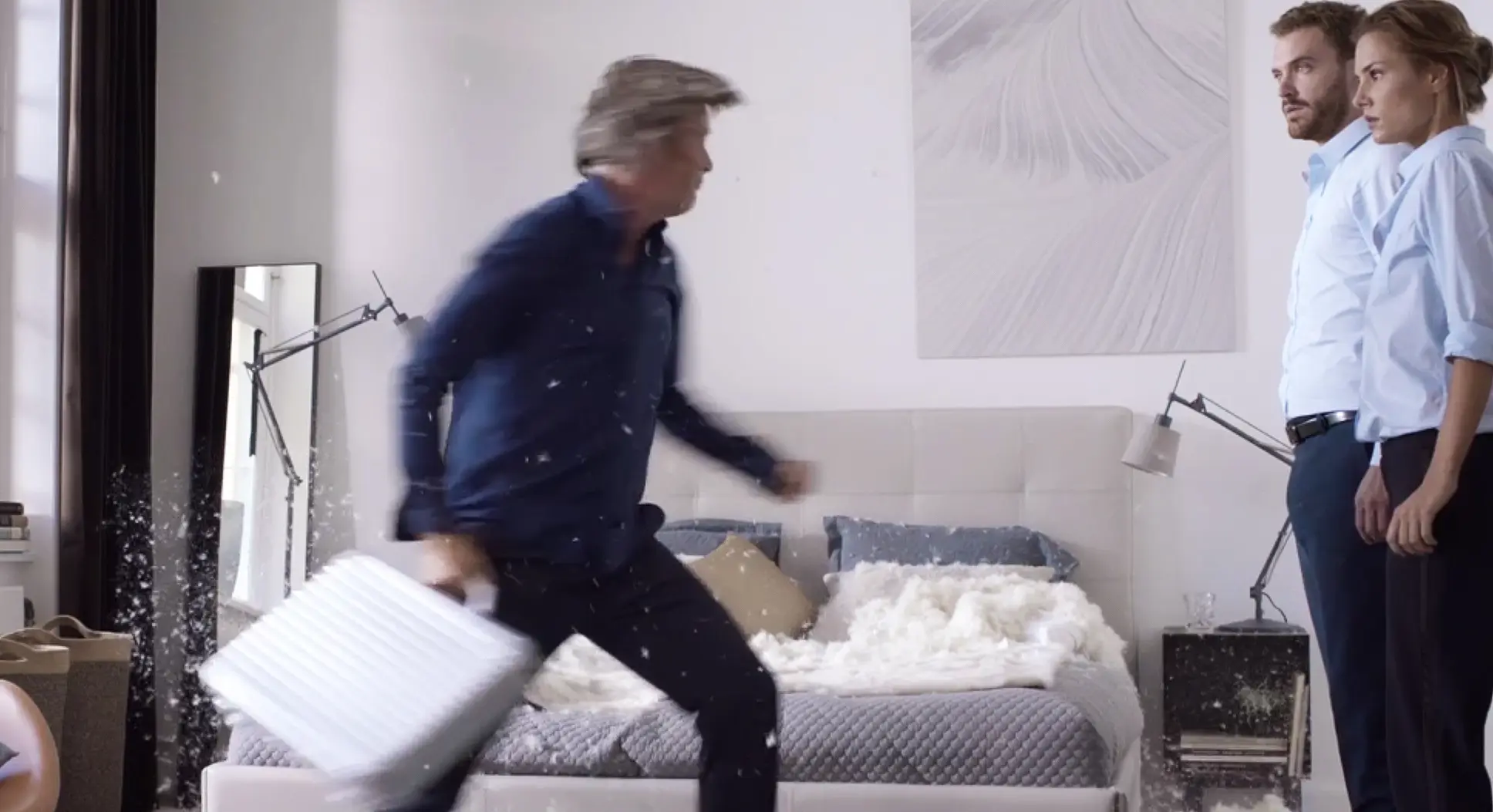 Mikkelsen interpreta un “monologo” de acción pura mientras destruye el espacio dándole paso a los interioristas de la marca de diseño danesa.