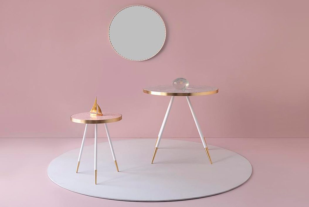 Las patas en forma de trípode y en blanco o negro están bañadas en latón y le acentúan su caracter sofisticado. Es una colección a la que su creadora describe como una serie que resalta la belleza natural de dos materiales (mármol y latón) que juntos se complementan y brillan.