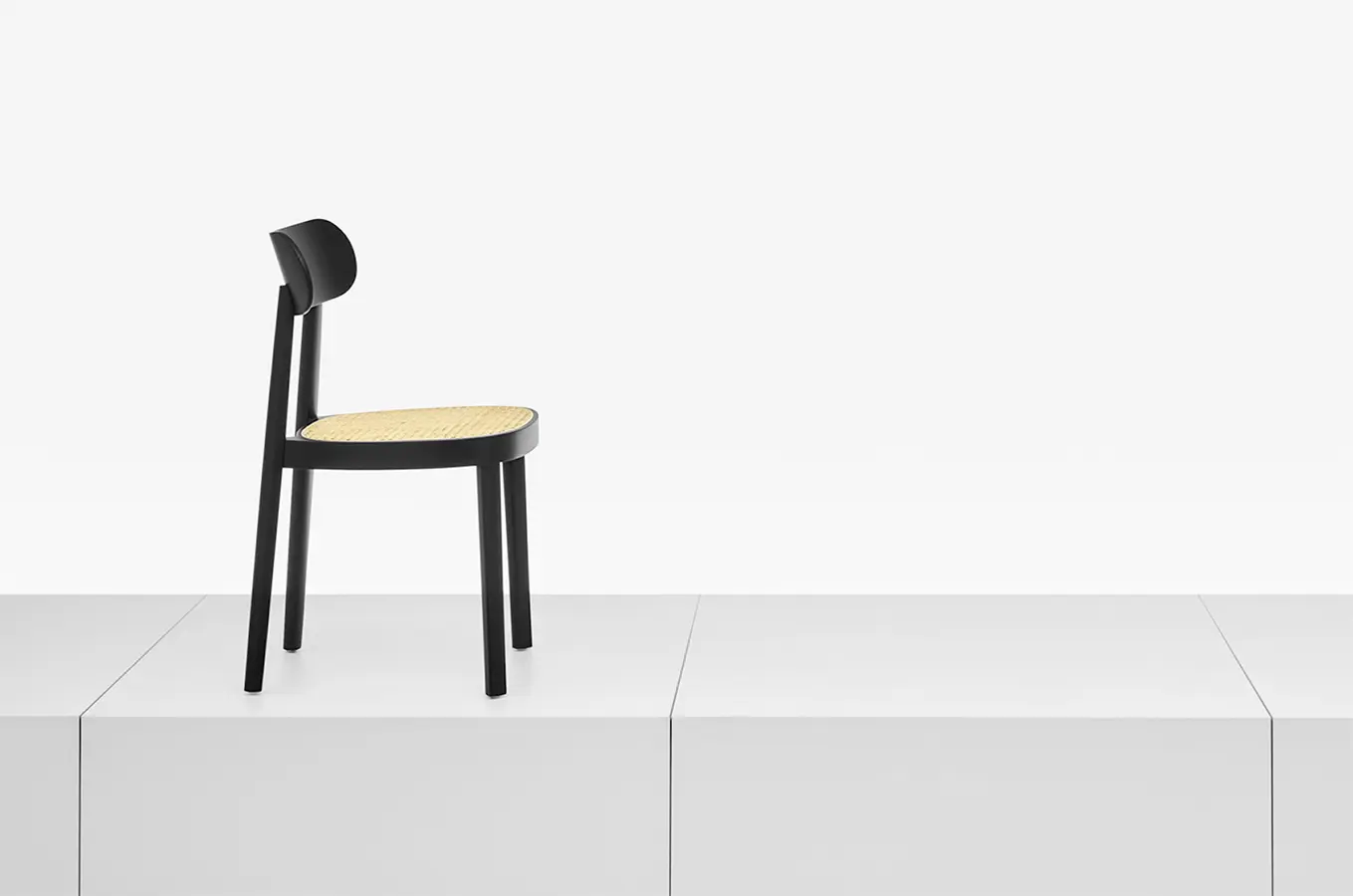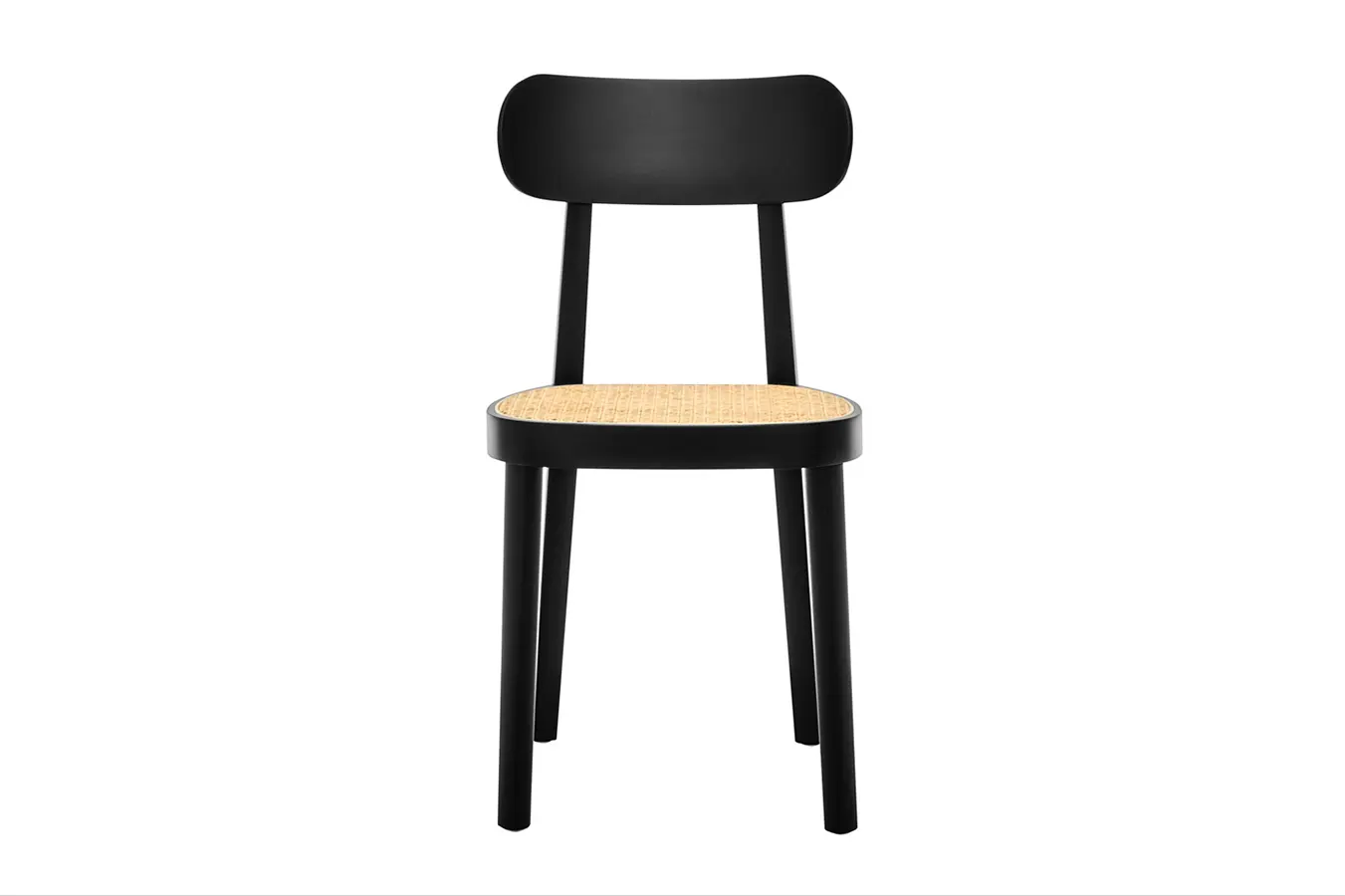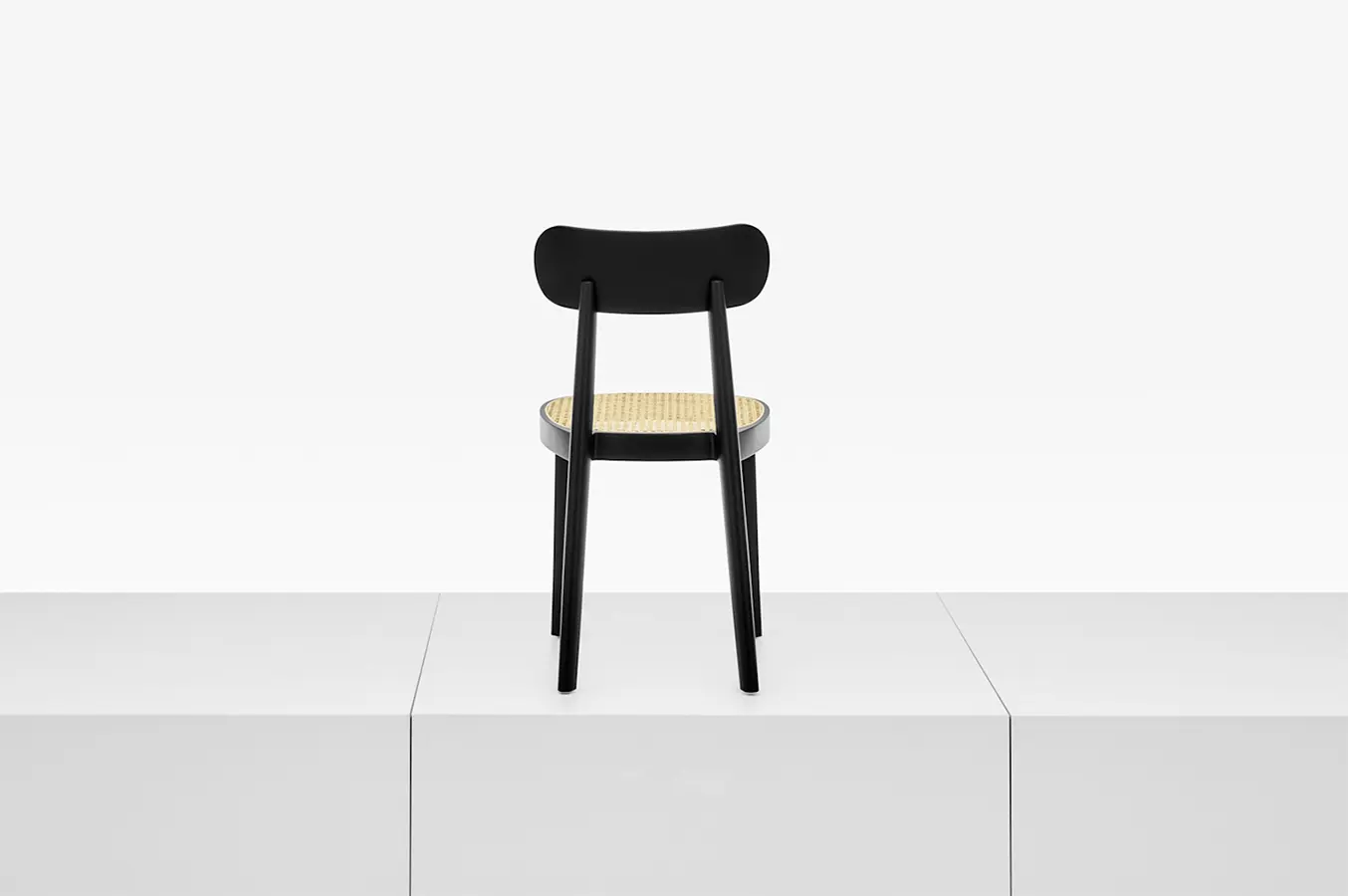 Sebastian Herkner agregó detalles sofisticados, que hacen que el diseño sea menos dominante y más noble. La forma de las patas de la silla es otra característica especial: están redondeadas en la parte posterior, y los bordes leves en la parte delantera crean una cierta ruptura, que alude a la forma de herradura de la superficie del asiento. El marco doblado del asiento y el asiento hecho a mano cubierto con un bastón de mimbre se refieren al arquetipo original de una silla Thonet, no. 214. La silla 118 está disponible opcionalmente con un asiento moldeado.