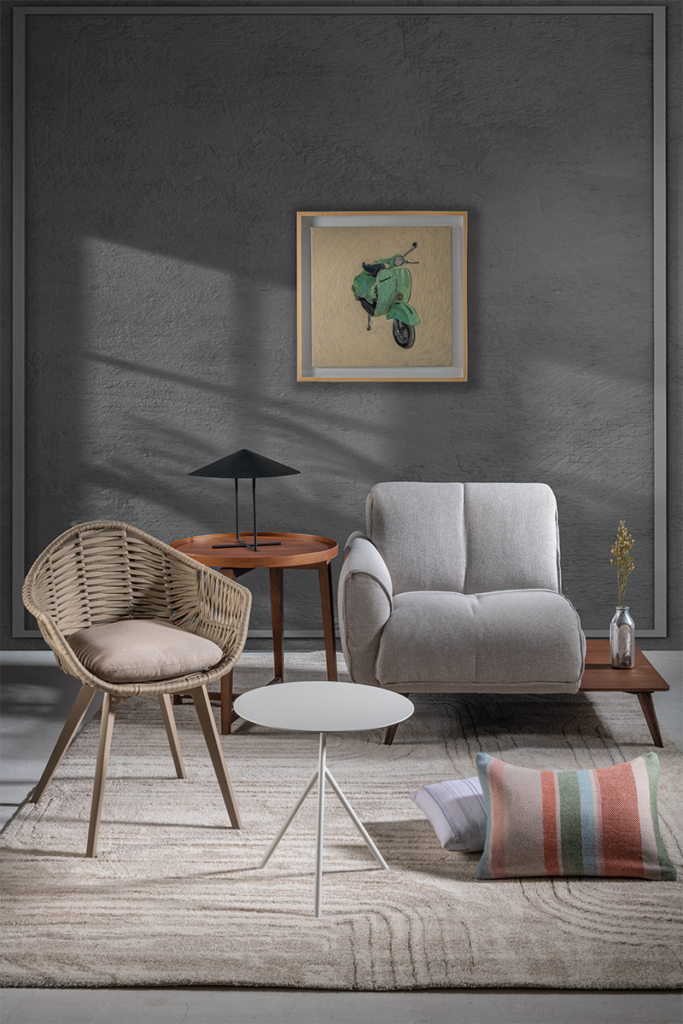 En la pared, Moto Vespa verde menta 50N objetada (2023), plastilina sobre madera, del artista Harold Rubio. Silla, referencia Tulipán, con estructura de aluminio, cuerda náutica de poliéster y cojín tapizado en lona impermeable agora kaki; en frente, mesa auxiliar, titulada Explorer, con estructura de aluminio color blanco; atrás, mesa auxiliar Laquila, de madera nogal.