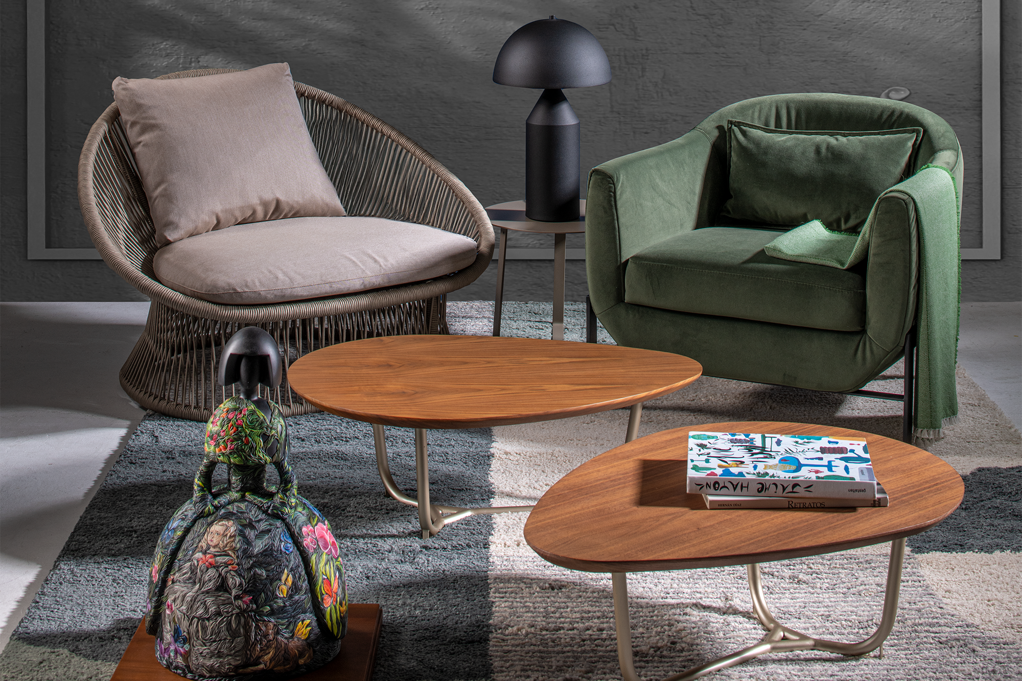 En la pared, El niño en la ventana (2024), plastilina sobre madera, del artista Harold Rubio. De izquierda a derecha, poltrona, referencia Spade, estructura de aluminio, cuerda náutica de poliéster y cojinería tapizada en lona impermeable agora kaki; al fondo, mesa auxiliar Apolo, con estructura de aluminio.