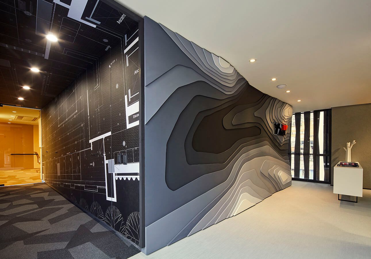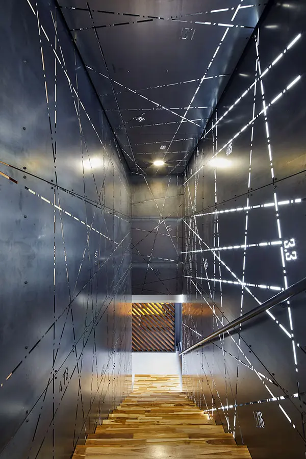 Una pieza fundamental de la propuesta es la escalera, eje central de las oficinas, ubicadas en el 4 y 5 piso del edificio (el ascensor llega de manera directa a este último). Aparte de ser un elemento funcional, se convierte en la lucha entre lo industrial y lo artesanal por medio de sus láminas de hierro con corte láser contrastadas con sus escalones de madera teca.