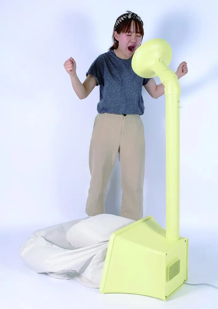 Usar los gritos para reducir las emociones negativas: las personas que suprimen las emociones son propensas a las enfermedades mentales. La máquina de ventilación Aspirator es una aspiradora psicológica que ayuda a las personas a ventilar las emociones negativas. Cuando la gente no está contenta, gritar o decir algo al Aspirador hará que el airbag se infla. Al final, las personas pueden crear un asiento hecho de sus propias emociones negativas y relajarse en él para encontrar soluciones a sus problemas. Crédito de la foto: Qing Deng; Koelnmesse.