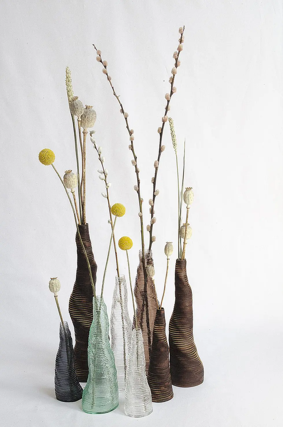 Inspirado en la forma simple de un abanico de papel, Fold combina el accesorio familiar con una solución de luz contemporánea. Al desplegar y colocar la pantalla de papel en el soporte de aluminio, la lámpara de mesa mejora esta interacción agradable pero lúdica entre sujeto y objeto. Fold contrasta el papel y el metal, la artesanía tradicional y el diseño industrial, encontrando así un equilibrio estético entre materiales connotados femeninos y masculinos. Crédito de la foto: Thalea Schmalenberg, Kasper Friis Egelund; Koelnmesse.Stratum Tempus es una colección de jarrones basada en una técnica de desarrollo propio, ecológica y consciente de los materiales. Mediante el corte con láser de material en láminas, como acrílico o bambú 100% reciclado en capas finas concéntricas, se crean objetos de forma cónica y orgánica con menos material y casi sin desperdicio. La forma espiral crea una elegancia natural. Como resultado, no tienen fachada y son cambiables cuando se mueven, creando una experiencia dinámica en el espacio. Crédito de la foto: Daan De Wit; Koelnmesse.