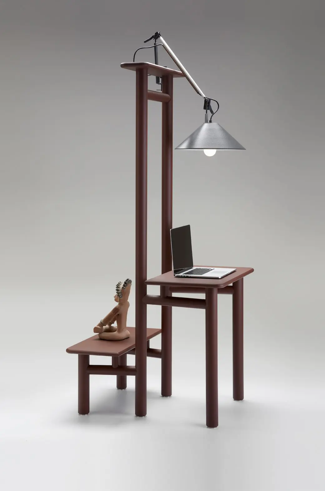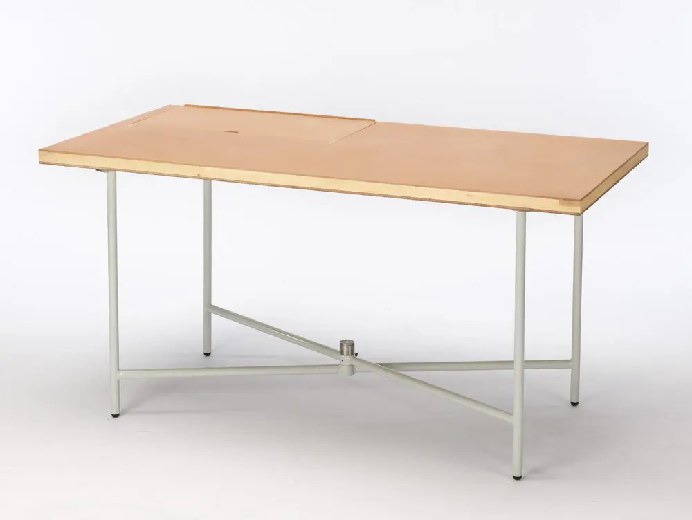 Levi: la mesa de trabajo reinventada. La pieza central del diseño es la articulación. La gama continua de ajustes en cualquier ángulo permite el uso universal de tamaños y formas de mesa muy diferentes. Levi es móvil, ligero, intuitivo y se puede montar y desmontar sin herramientas. Plegada, la base X es un diseño que ahorra espacio para guardarlo fácilmente y, empaquetado de forma plana, mantiene bajos los costos de almacenamiento y transporte. Crédito de la foto: Marie Kurstjens, Iva Coskun; Koelnmesse.