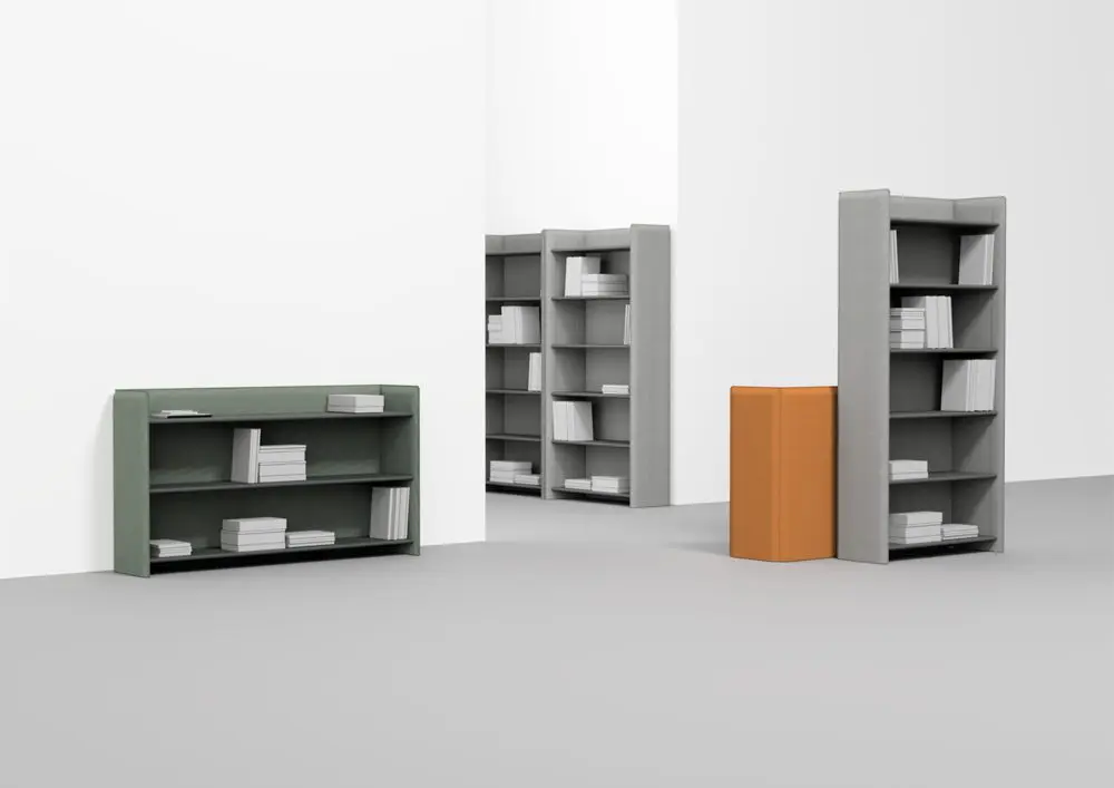 Binomio es una pieza híbrida, un objeto de dos lados que consta de tres estantes simples colocados a diferentes alturas del piso. Es multifuncional: se puede usar como escritorio o como armario, pero también puede ser una mesa para cenar solo, un banco para quitarse los zapatos, una percha, una mesita de noche, una estantería, un altar o un armario. dieu, así como un soporte para cualquier tipo de objeto. Binomio está hecho de madera de haya maciza lacada. Crédito de la foto: Studio Giunta; Giuseppe Arezzi; Koelnmesse.SoftShelf es un sistema de estantería minimalista. Las paredes tapizadas con detalles de costura funcionales forman el marco para estantes, cajones y muchos otros elementos. Estas características hacen del sistema de estanterías un producto universal para amueblar los espacios más diversos. Crea una atmósfera acogedora y, naturalmente, también asume la función de elementos acústicos. Crédito de la foto: Peter Otto Vosding; Koelnmesse.