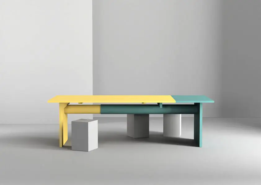 PIPE-LINE es una mesa extensible cuyo mecanismo sirve como característica de diseño central. Dos tubos fluyen uno dentro del otro similar a una barra telescópica y funcionan simultáneamente como el mecanismo de extensión y el marco. Los tornillos visibles en los laterales y la pantalla demostrativa de todas las partes funcionales hacen de PIPE-LINE una mesa extensible única. El color indica la función de la tabla y resalta las partes a mover. Crédito de la foto: Peter Otto Vosding; Koelnmesse.